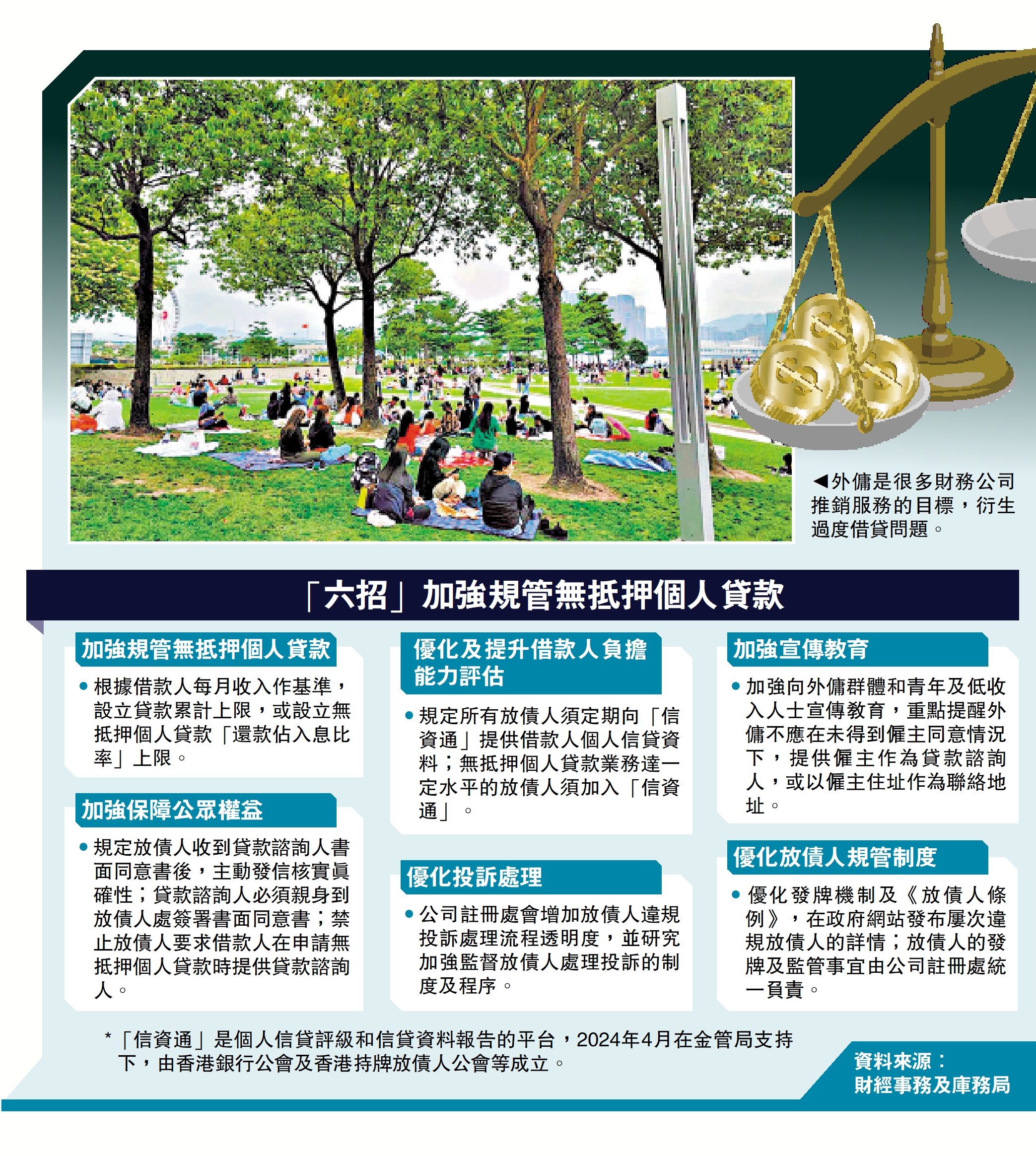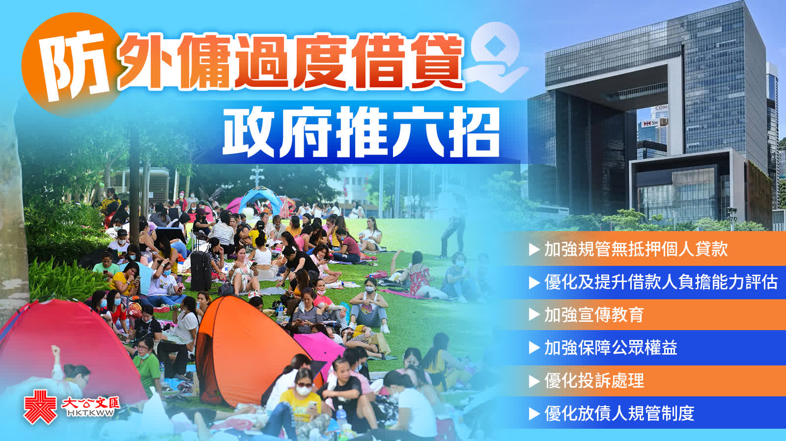 (大公報 記者 賴振雄)現時外傭在港借貸門檻低,一旦欠債連累僱主受滋擾。政府建議加強規管持牌放債人,推出六項措施,包括建議根據借款人每月收入作基準,設立無抵押個人貸款累計上限等。有立法會議員建議,加大對違規財務公司的罰則,也有議員認為必須規定外傭合約期最後半年不得借貸。