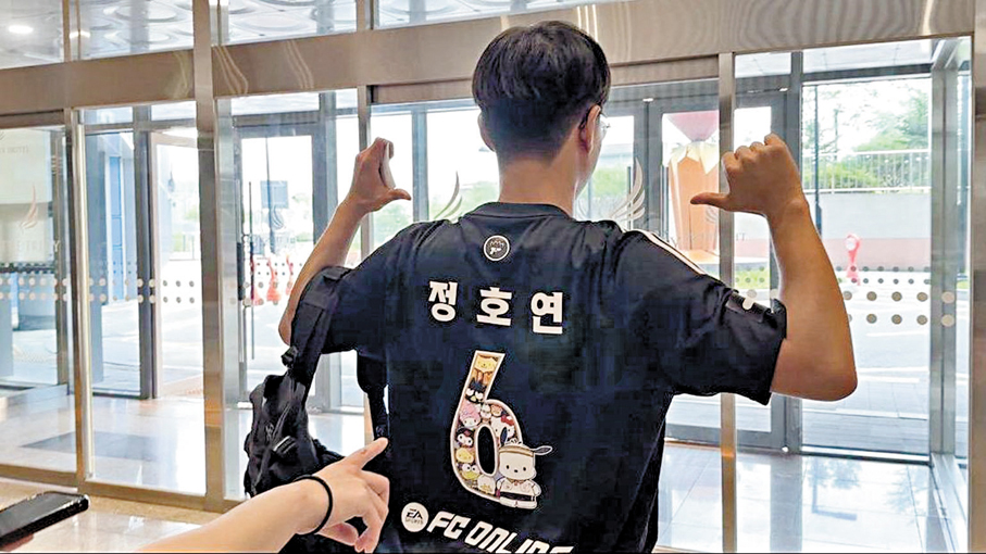 港足即將在今晚東亞錦登場,記者在周一下午來到龍仁市入住酒店準備,正在苦惱手記內容之際,Check-in後回頭看到兩個年輕男生,其中一名身穿黑色足球球衣,被他胸前和背後印上的Sanrio卡通公仔所吸引。雖然看不懂球衣上的韓文,可是在這地穿上足球球衣的,幾可肯定是晚上入場支持韓國隊的球迷。