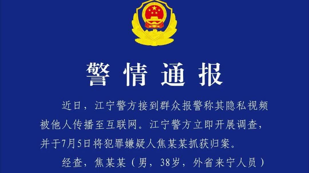 近日,江寧警方接到群眾報警稱其隱私視頻被他人傳播至互聯網。江寧警方立即開展調查,並於7月5日將犯罪嫌疑人焦某某抓獲歸案。