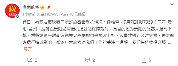 海南航空今日(8日)發布通報稱,近日,有網友反映我司航班旅客錯登機情況。經核查,7月7日HU7359(三亞-貴陽-蘭州)航班在貴陽龍洞堡機場過站保障期間,有目的地為貴陽的旅客未及時下機,乘務組第一時間識別並妥善安排相關旅客下機。該事件得到及時處置,未對航班運行造成影響。感謝廣大旅客對我們工作的關注與理解,我們將持續提升服務品質,保障旅客順暢出行。