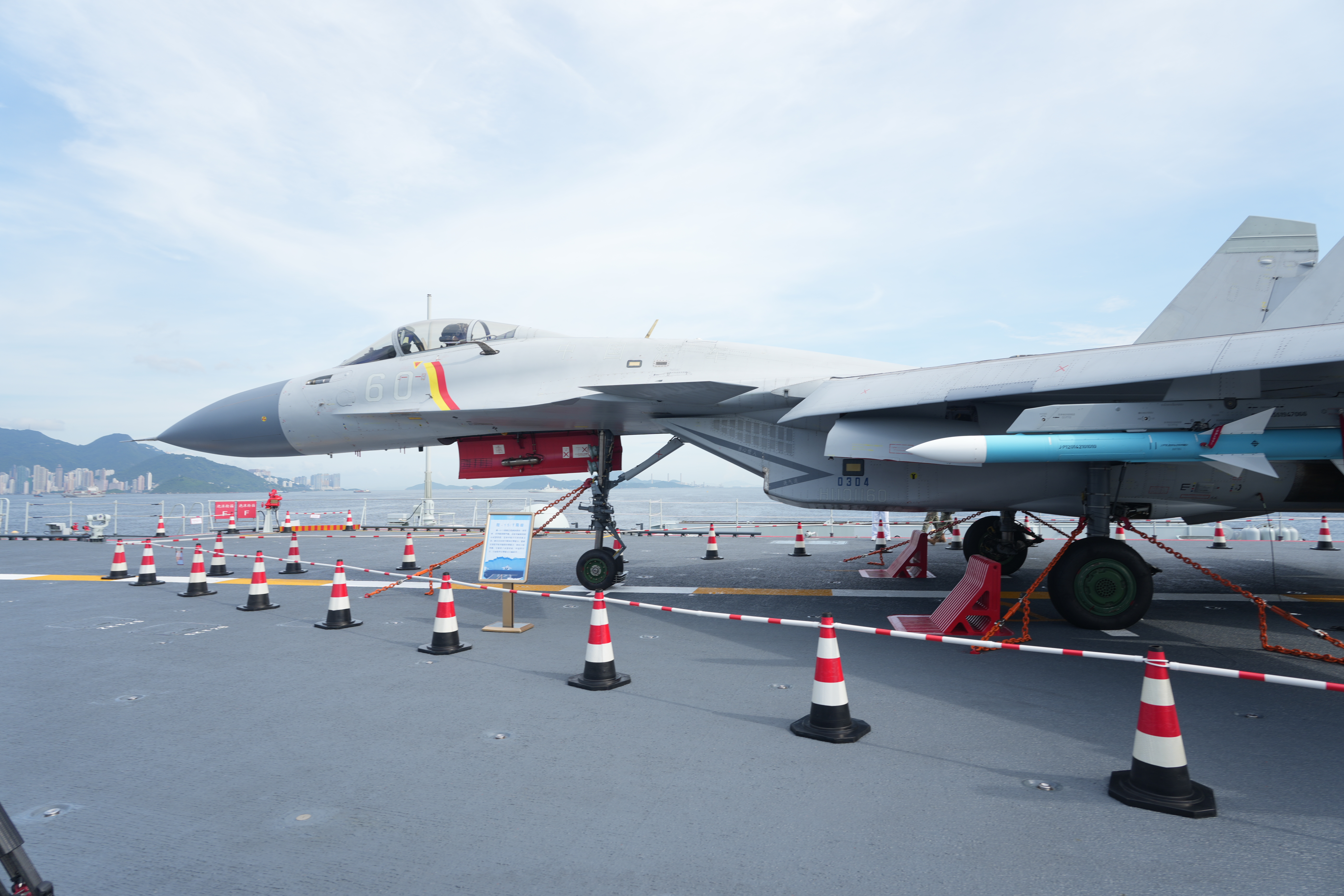 由航母山東艦,導彈驅逐艦延安艦、湛江艦,導彈護衛艦運城艦組成的海軍艦艇編隊,自7月3日起訪港5天。山東艦甲板上整齊排列着殲-15、殲-15T艦載戰鬥機,展現出中國航母戰鬥群的實戰能力。殲-15解決了中國航母艦載機「從無到有」的問題,而殲-15T實現了「從有到強」的跨越。在瀋陽的航空科技館展示着一條橫幅,上面寫着「堅決完成殲-15飛機上艦任務」,條幅上有殲-15現場總指揮羅陽、總設計師孫聰等人的簽名。