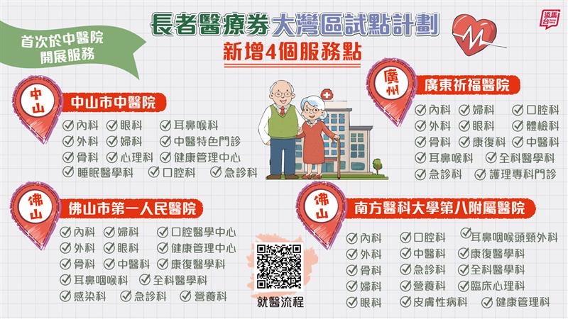「長者醫療券大灣區試點計劃」本月內進一步新增4個服務點,亦是首次加入中醫院,接受合資格香港長者使用醫療券,支付指定科室的門診醫療護理服務費用。