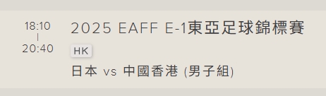 大公文匯全媒體報道,東亞足球錦標賽(東亞盃)決賽周正在韓國龍仁市舉行,香港足球代表隊將於今晚(8日)出戰,對陣強敵日本隊。比賽將於傍晚6時24分開波,港台電視32及港台YouTube頻道免費直播。根據節目表,直播節目將於傍晚6時10分開始。
