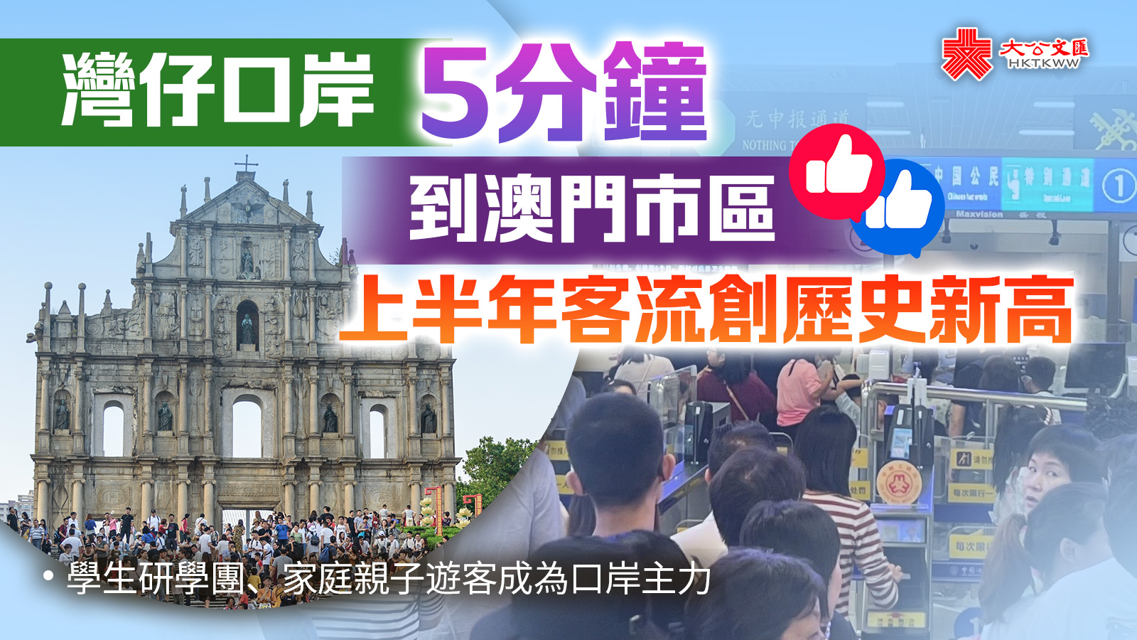 (大公文匯網記者 方俊明)粵港澳大灣區跨境客流持續掀起熱潮。記者今天(8日)從珠海邊檢總站灣仔邊檢站獲悉,作為澳門連接珠海最便捷的海上通道,灣仔口岸坐船5分鐘即可到達澳門市區;而今年上半年該口岸出入境人員超過88.8萬人次,同比增長16.5%,創下歷史新高。