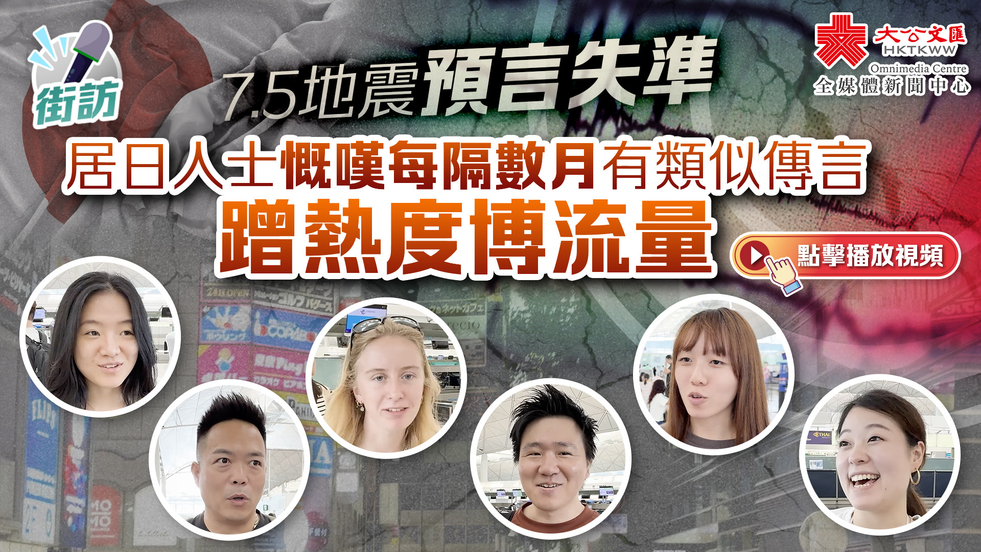 大公文匯全媒體報道,曾準確預告多場地震的日本知名漫畫家龍樹諒在其代表作《我所看見的未來》中提及,7月會有大災難,其言論隨即被外界解讀為日本在7月5日會有大地震。儘管最終未有發生,但有關傳言已經嚴重影響各地民眾的赴日旅遊意願,有專家更估計事件對日本造成至少5600億日圓的經濟損失。對於預言失準,記者早前在機場採訪多名市民及旅客,有受訪者批評這類傳言是「蹭熱度,搏流量」。