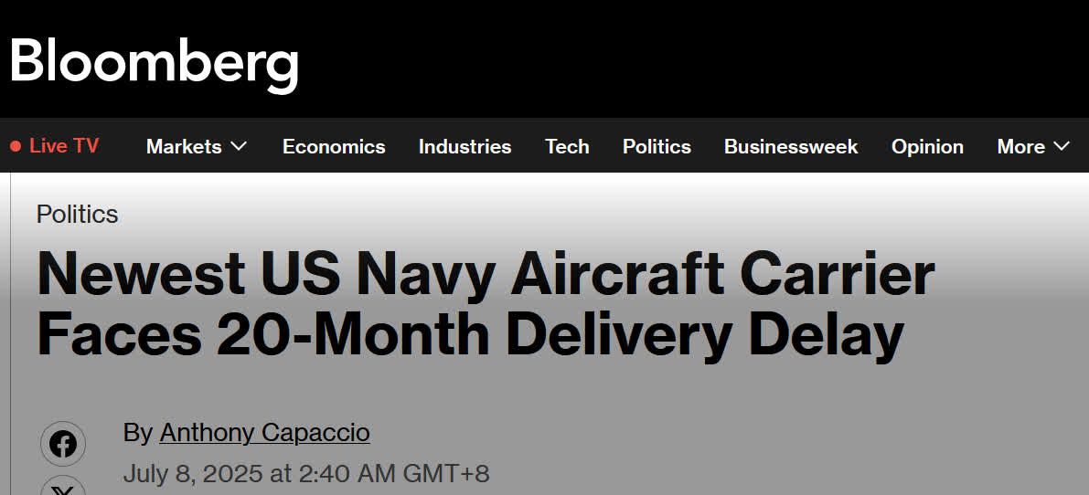 彭博社稱,「約翰·肯尼迪」號原定於2025年7月交付,交付時間可能會推遲至2027年3月。報道說,製造商在生產和安裝有關升降機方面遇到了問題。