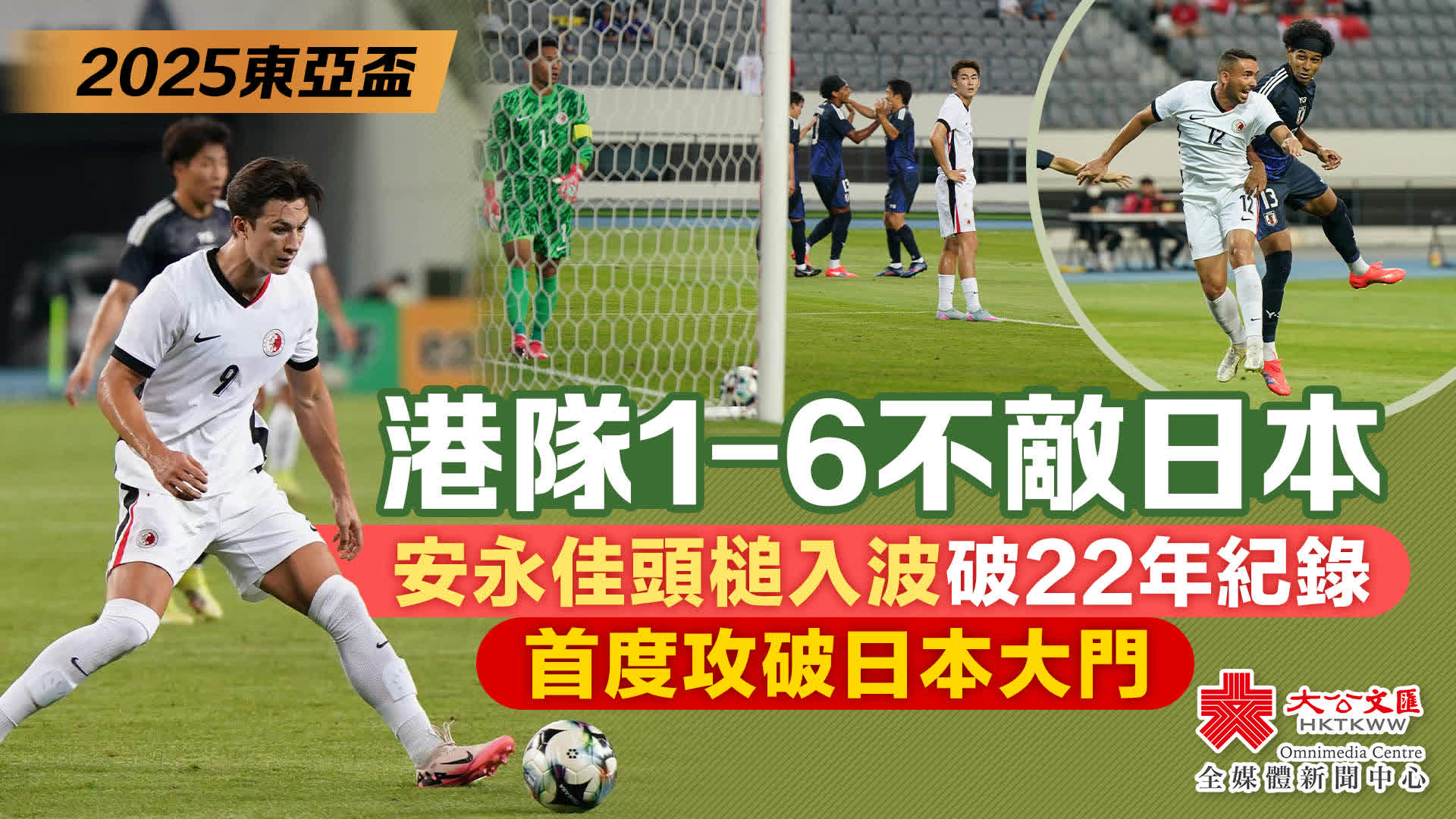 大公文匯全媒體報道,東亞足球錦標賽(東亞盃)決賽周正在韓國龍仁市舉行,香港足球代表隊今(8日)晚出戰,對陣亞洲「一哥」日本隊。半場比賽結束,港隊0-5落後日本隊,其中日本隊傑梅恩·良上半場獨取「大四喜」,下半場安永佳幫助港隊扳回一城,全場比賽港隊1-6不敵日本隊。