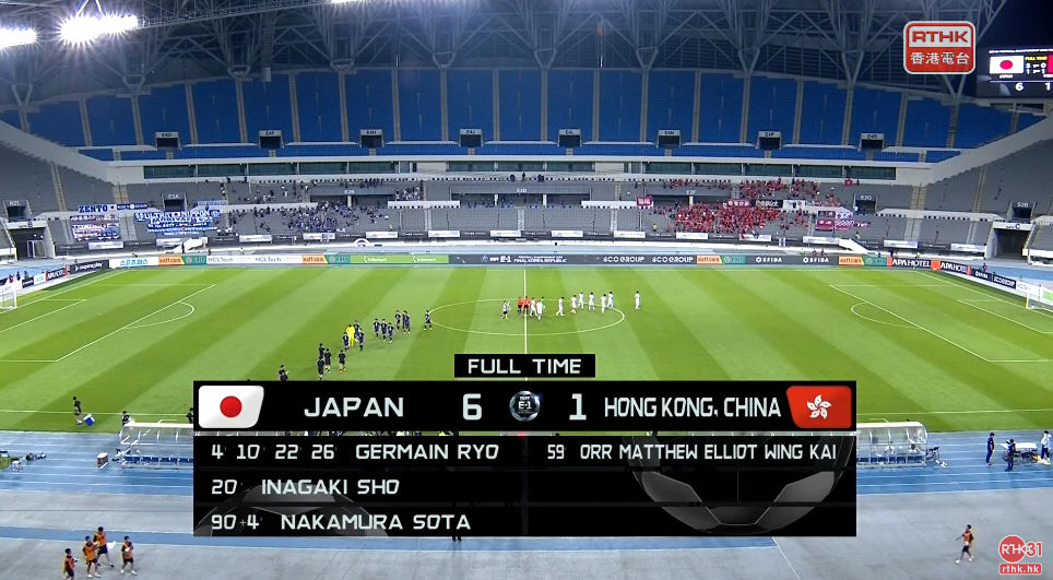 比賽第93分鐘,日本隊邊界開波,26號中村草太接球後直接帶球進攻,連續避過港隊防守球員,突入禁區直射,成功破門,日本隊6-1港隊。