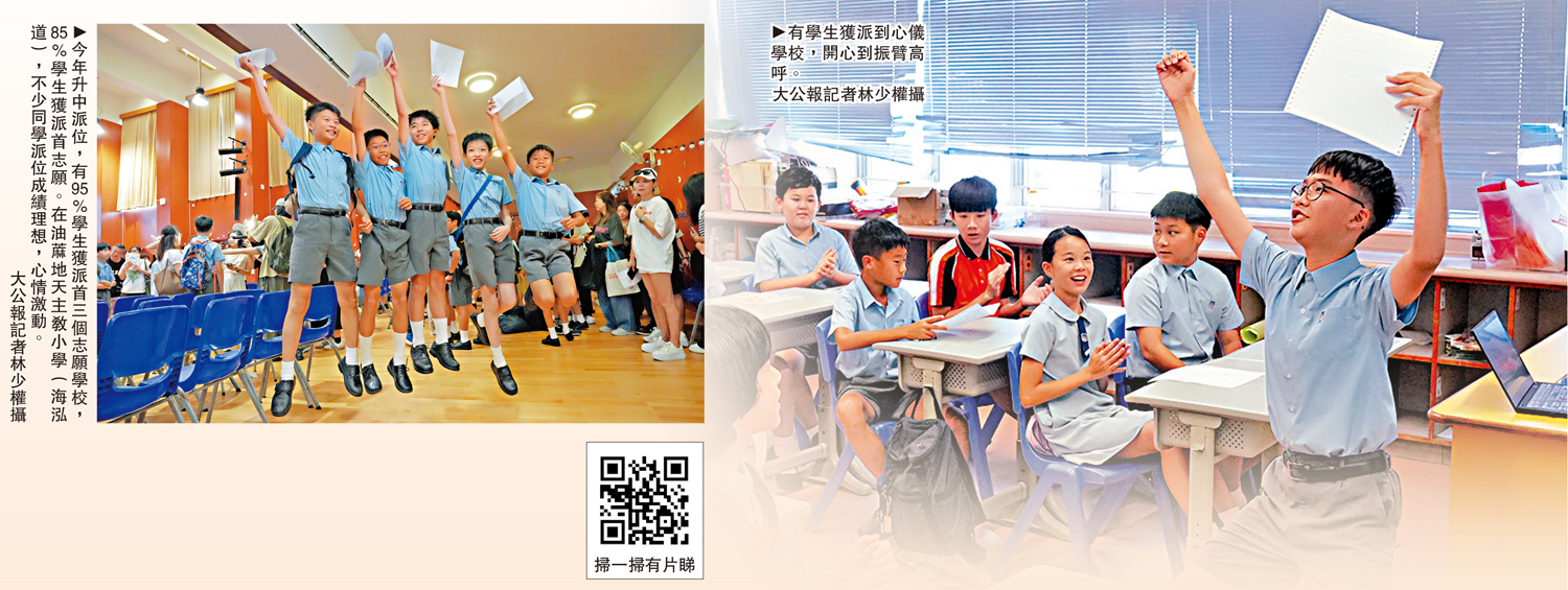 升中派位結果昨日公布,在油蔴地天主教小學(海泓道),大公報記者還未走入教室便聽見裏面傳來一聲:「Yeah!我成功了!」有同學接過派位證的瞬間立刻擺出勝利姿態。陳淑儀校長認為,今年派位滿意率創新高原因有二,其一是香港學生人數減少,另外家長受「心理因素」影響,例如社會廣泛討論有高才或優才家庭抵港,或擔心升學競爭持續上升,因此採較為保守的選校策略,令不少學生獲派心儀中學。今年最多學生入讀華仁書院(九龍),其次為循道中學、聖方濟書院。