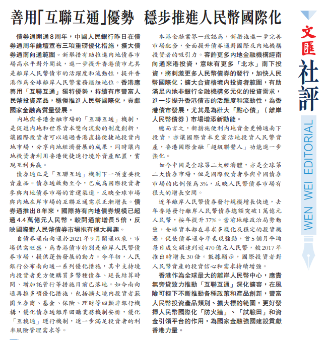 債券通開通8周年,中國人民銀行昨日在債券通周年論壇宣布三項重磅優化措施,擴大債券通南向通範圍。新舉措有助推進內地債券市場高水平對外開放,進一步提升香港債市尤其是離岸人民幣債市的活躍度和流動性,提升香港作為全球離岸人民幣業務樞紐地位。香港應善用「互聯互通」獨特優勢,持續有序豐富人民幣投資產品,穩慎推進人民幣國際化,貢獻國家金融高質量發展。