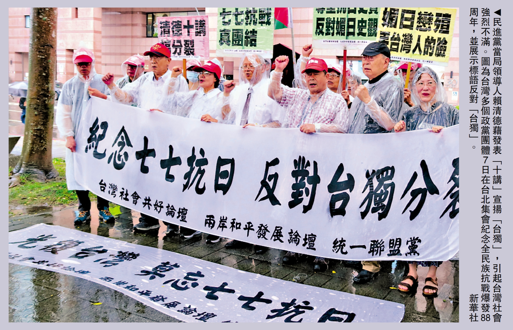 今年7月7日是「七七事變」88周年,朱立倫表示,抗戰勝利後,台灣結束50年的殖民統治,今年也是台灣光復80周年,這段歷史對台灣具有非凡而深刻的意義,大家更應珍惜這來之不易的自由與和平。遺憾的是,近期賴清德不斷在其「亂台十講」中散布謠言,甚至為了達到「台獨」的目標,不惜扭曲歷史事實。
