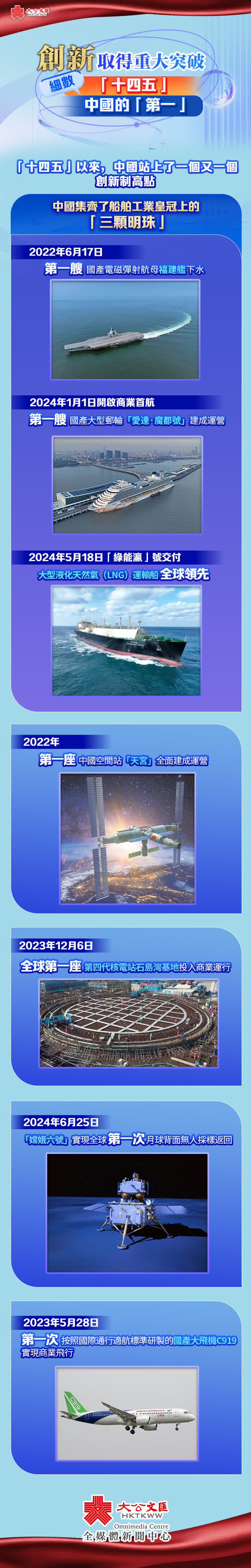 (大公文匯網 記者 任芳頡)國家發展改革委主任鄭柵潔9日在國新辦「高質量完成『十四五』規劃」首場新聞發布會上介紹,「十四五」以來,中國站上了一個又一個創新制高點,第一艘國產電磁彈射航母福建艦下水,第一艘國產大型郵輪「愛達·魔都號」建成運營,大型液化天然氣(LNG)運輸船全球領先,中國集齊了船舶工業皇冠上的「三顆明珠」;第一座中國空間站「天宮」全面建成運營,全球第一座第四代核電站石島灣基地投入商業運行,「嫦娥六號」實現全球第一次月球背面無人採樣返回,第一次按照國際通行適航標準研製的國產大飛機C919實現商業飛行。