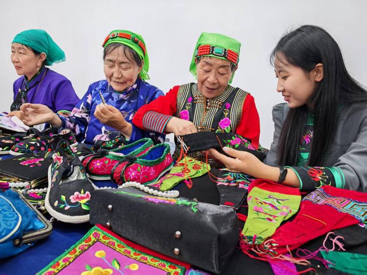 在薩日郎巾幗民族手工藝品專業合作社,綉娘們飛針走線,將草原花卉、野生動物等元素融入作品。這個由共產黨員秀雲於2016年創辦的合作社,已帶動87名成員就業,年均銷售收入超80萬元。通過免費培訓、訂單合作等方式,合作社累計培訓3667人,其中貧困戶300餘人,實現「輸血式」扶貧向「造血式」扶貧轉變。
