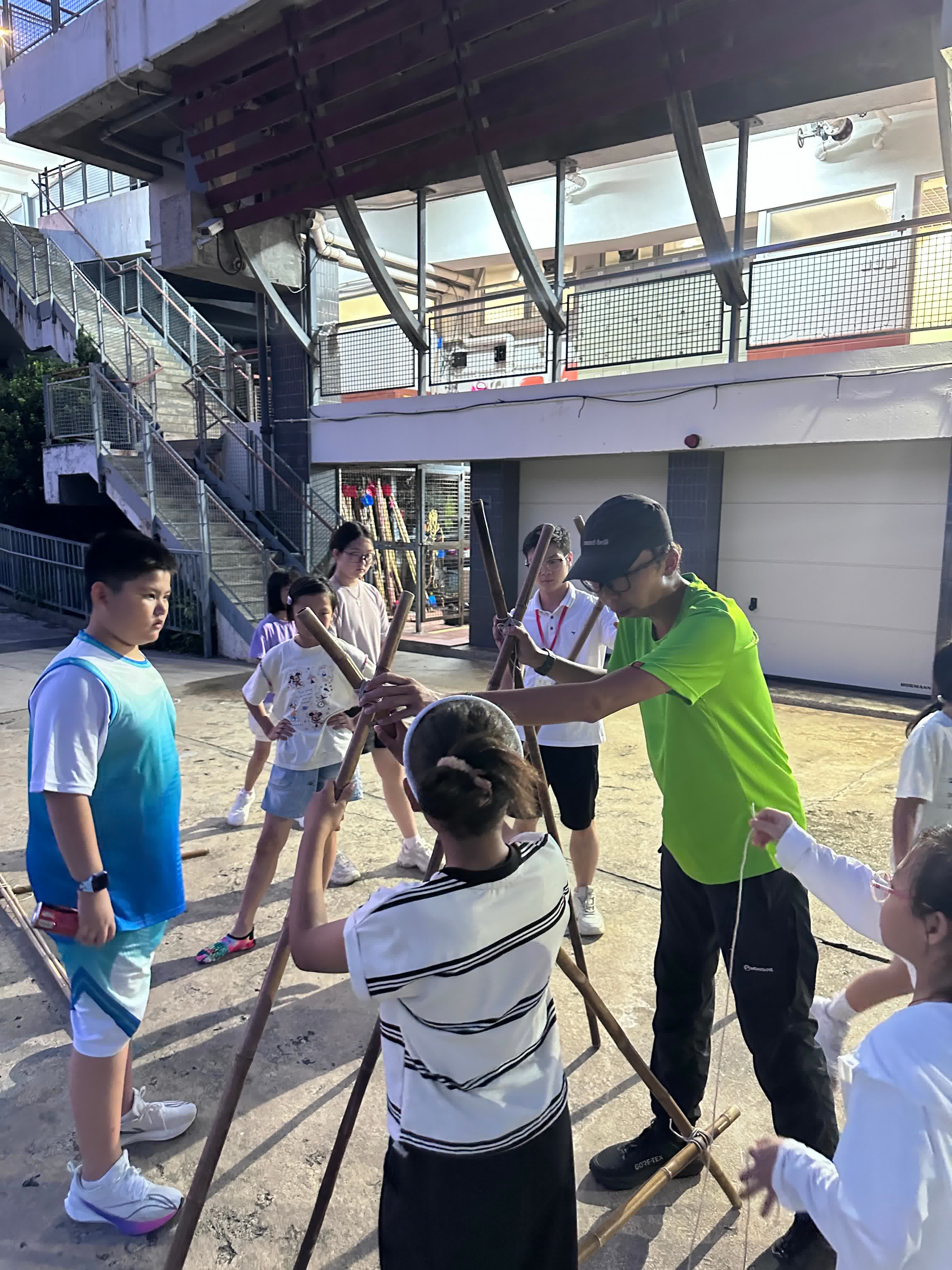午餐後,研學團抵達紮營地——西貢青協。四周群山環抱,碧海藍天相映成趣,淺灘蜿蜒、水天一色,開闊的自然景致令人心曠神怡。開營儀式上,老師詳細介紹創科營特色內容、每日行程以及注意事項。學生們認真聆聽,積極互動。在破冰環節,Ginny老師設計了富有創意的「三句話自我介紹+個性Pose」及「接龍創編故事」等遊戲,現場氣氛活躍,笑聲不斷,迅速拉近了孩子們之間的距離。在「迷你炮台」實踐活動中,學生們在教官引導下動手取材、搭架、調整、驗證,鍛煉了解決問題的能力與團隊合作精神。