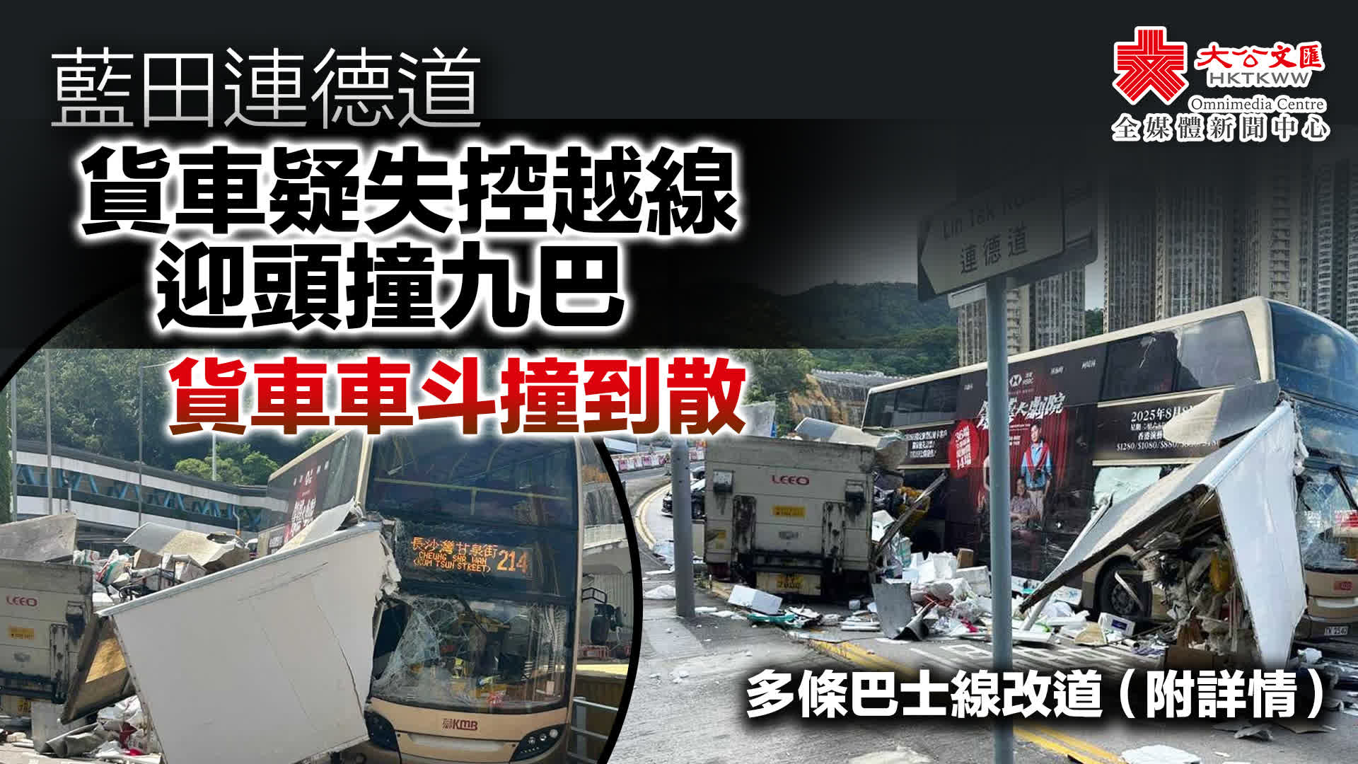 大公文匯全媒體報道,今日(9日)上午9時半左右,藍田連德道來往秀茂坪及藍田方向,有巴士與貨車相撞。九巴回應指,一輛路線214九巴巴士駛至連德道時,對面線一輛貨車疑失控越線撞向巴士車頭,初步車長及多名巴士乘客受傷。