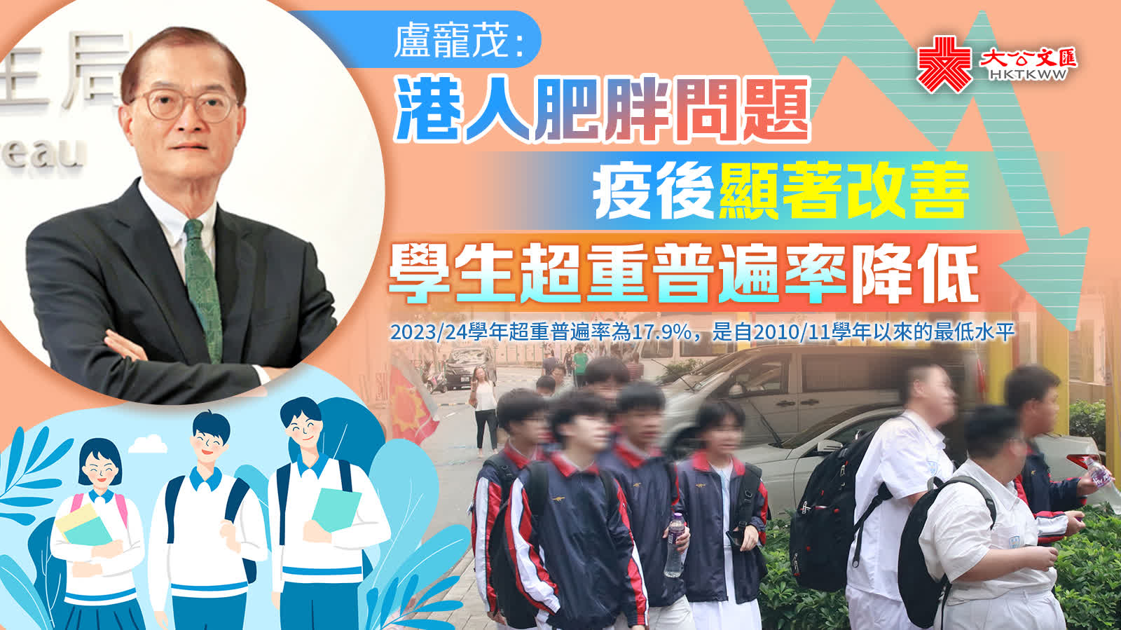 盧寵茂指,政府留意到疫後相關情況已有顯著改善跡象,例如2020至2022年的人口健康調查結果顯示,18歲或以上人士當中,有24.8%的體能活動不足,而2023年的健康行為調查顯示有關比例下降至14.8%。另外,衞生署學生健康服務的數據顯示,中小學生肥胖及超重問題在疫後有改善,普遍率由2021/22學年的21.2%,下降到2023/24學年的17.9%,是自2010/11學年以來的最低水平。