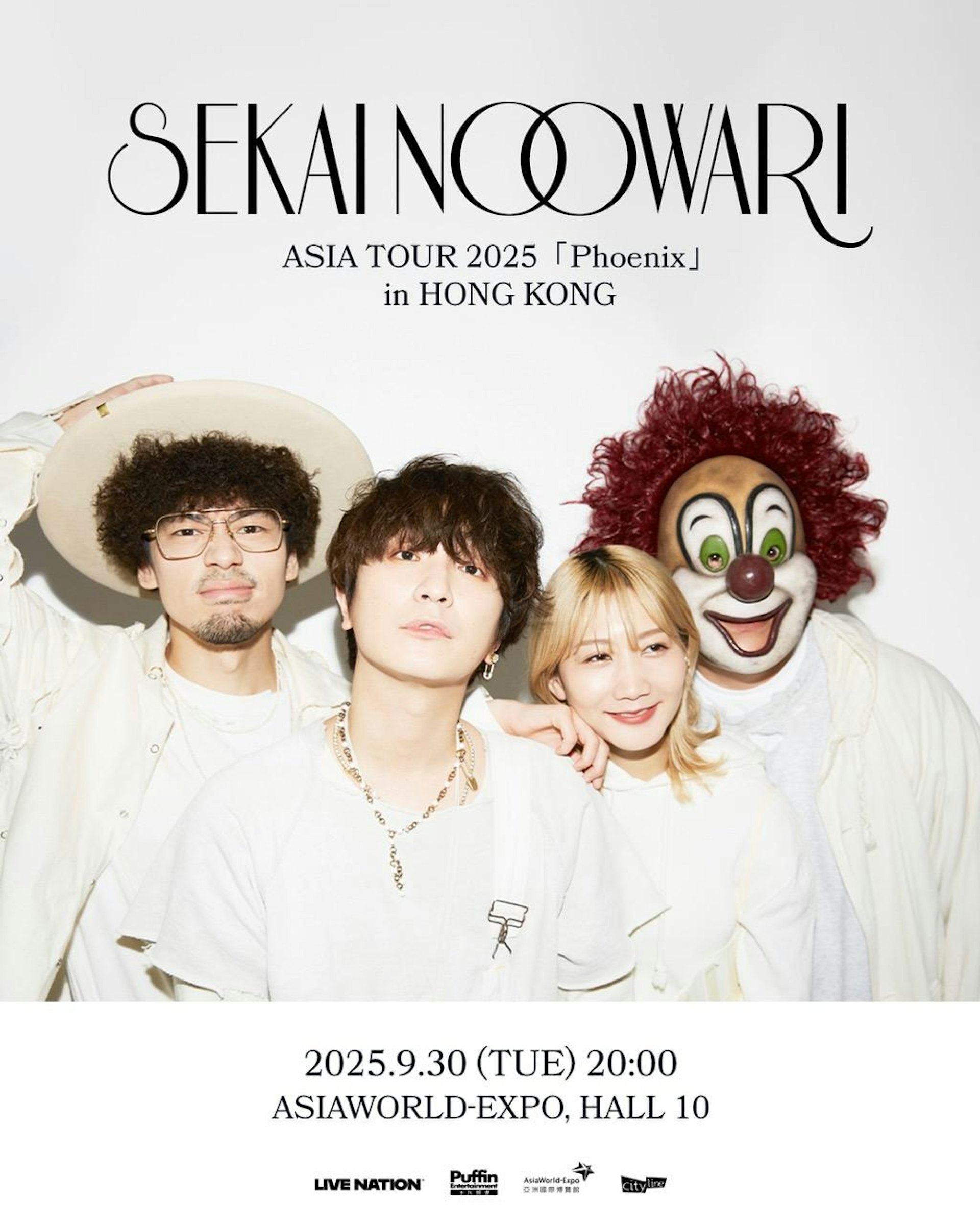 大公文匯全媒體報道,日本人氣樂團SEKAI NO OWARI(世界末日)4位成員主唱Fukase、吉他手Nakajin、鋼琴手Saori和戴着小丑面具的DJ LOVE時隔6年再度來港,將於9月30日在亞洲博覽館舉行亞巡香港站。門票今日(9日)下午3時公開發售,粉絲不容錯過!(點此購票)