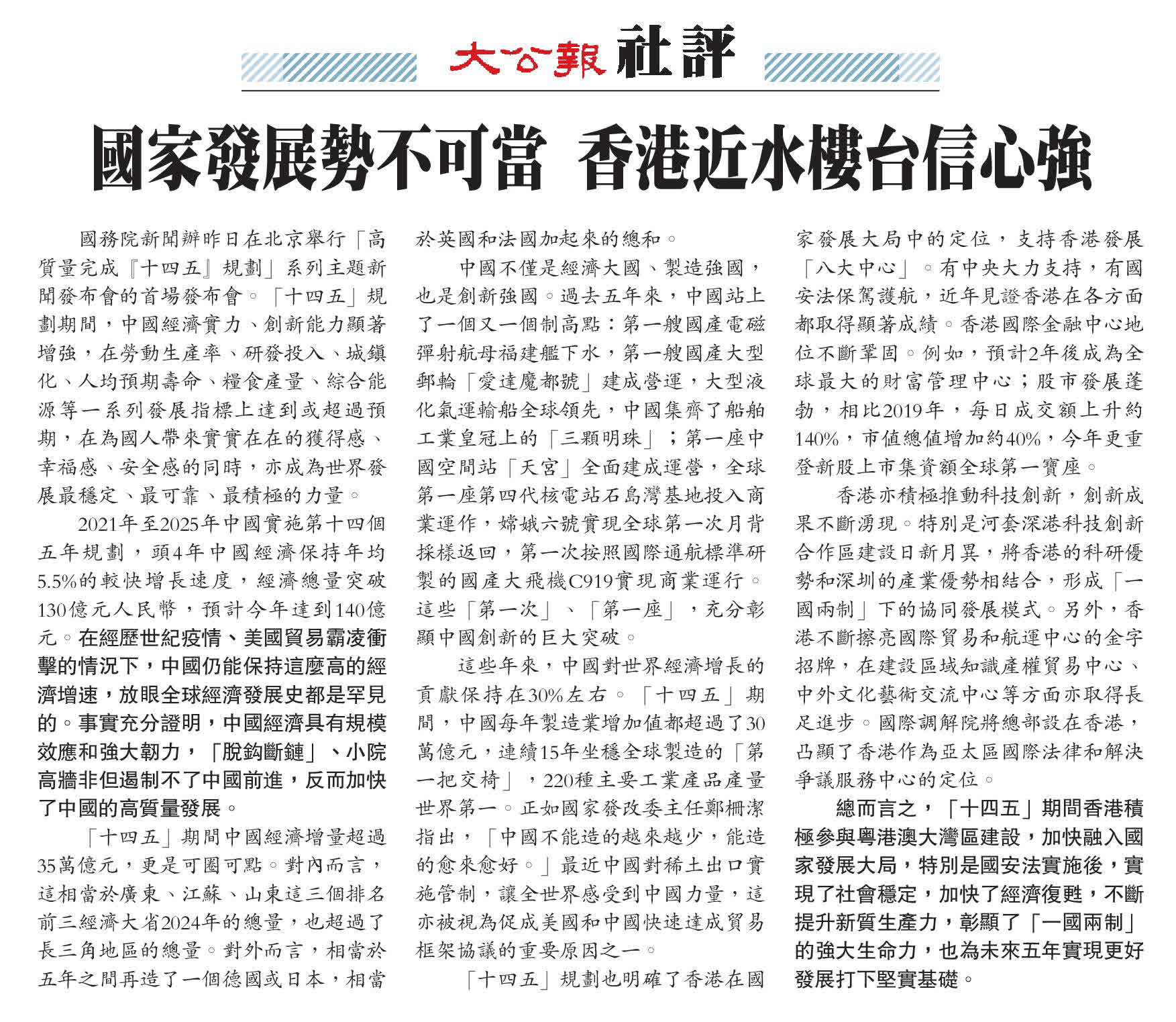 總而言之,「十四五」期間香港積極參與粵港澳大灣區建設,加快融入國家發展大局,特別是國安法實施後,實現了社會穩定,加快了經濟復甦,不斷提升新質生產力,彰顯了「一國兩制」的強大生命力,也為未來五年實現更好發展打下堅實基礎。