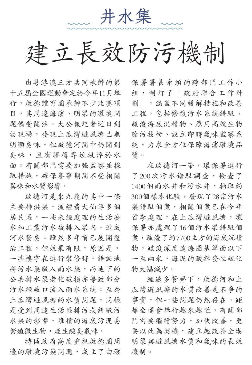 經過多管齊下,啟德河和土瓜灣避風塘的水質改善是不爭的事實,但一些問題仍然存在。距離全運會舉行越來越近,有關部門需要繼續努力,加快改善,更要以此為契機,建立起改善全港明渠與避風塘水質和氣味的長效機制。