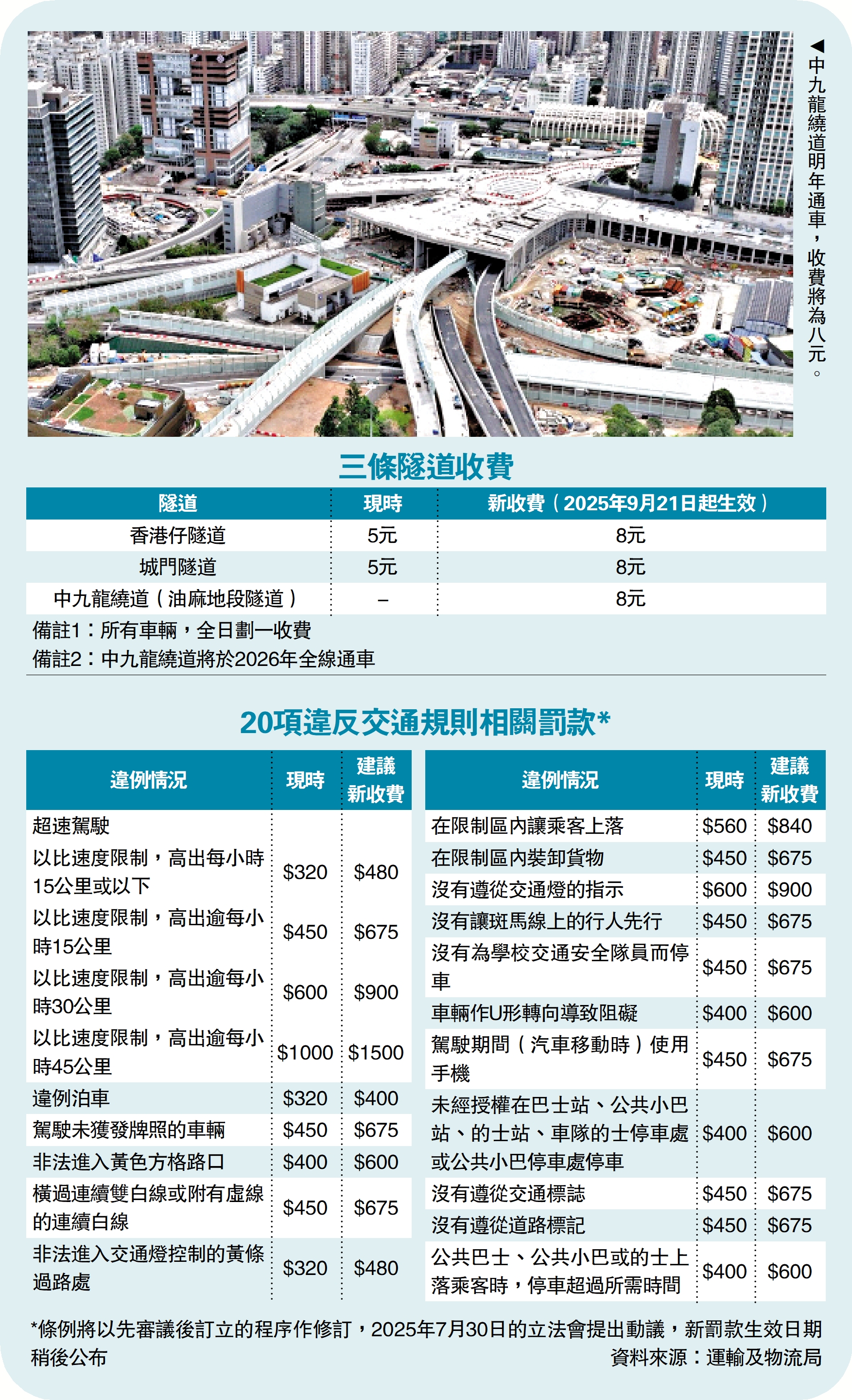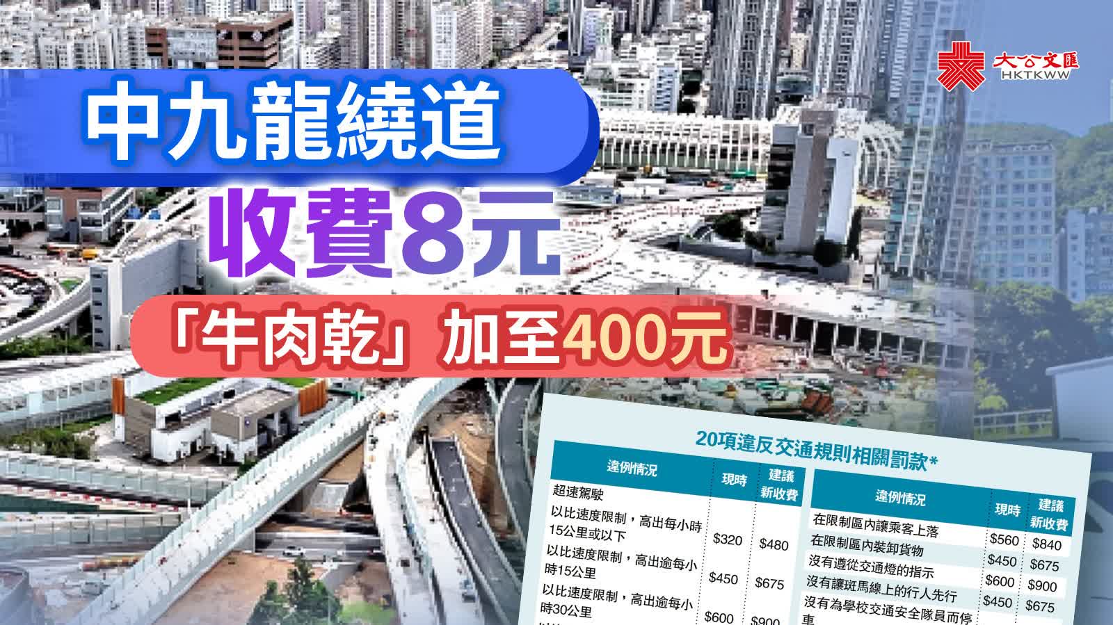 (大公報 記者 賴振雄)特區政府昨日宣布,建議調整多項與交通相關費用,已經30多年沒有調整收費的香港仔隧道和城門隧道,今年9月21日起隧道費由現時五元加價至八元,以達至營運收支平衡;中九龍繞道明年全面通車,新落成的中九龍繞道油麻地段隧道收費八元,低於原先建議十元。違例泊車、超速、衝紅燈、禁區上落車等20項交通違例罰款,分別上調25%至50%。