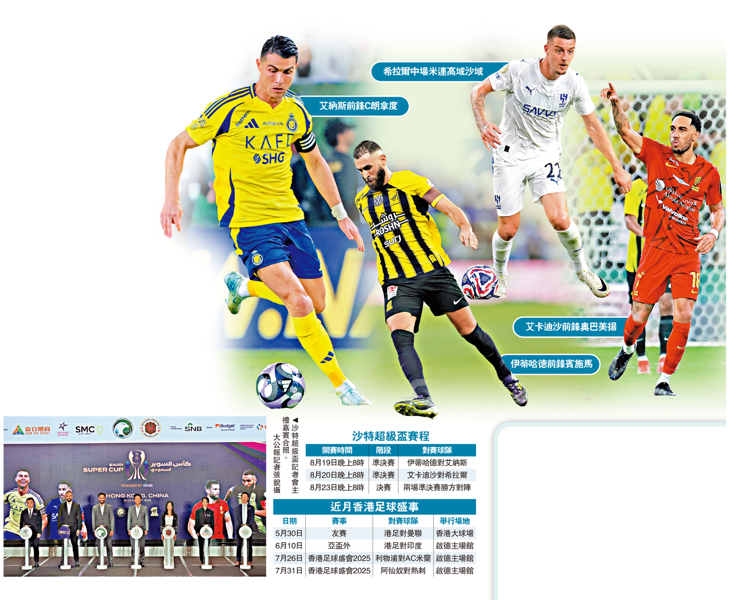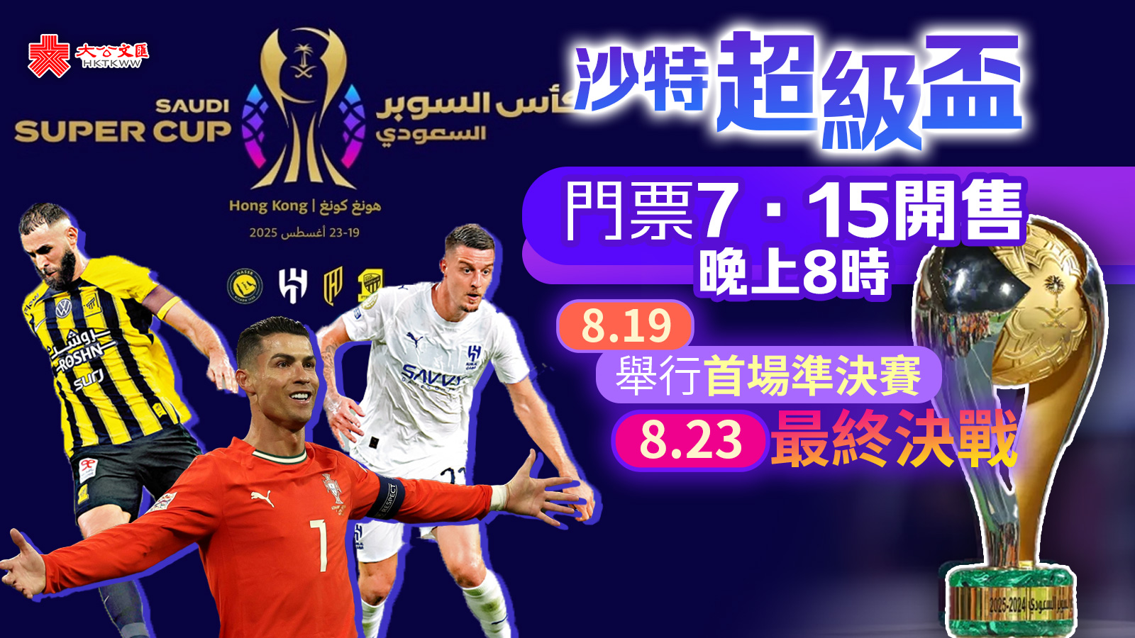 (大公報 記者 張銳)沙特超級盃將於8月19日至23日首度移師香港舉行,4支沙特阿拉伯足球聯賽頂級球隊於香港大球場爭冠。賽事有望雲集多位世界級球星,包括艾納斯的C朗拿度、伊蒂哈德的賓施馬、希拉爾的米連高域沙域及艾卡迪沙的奧巴美揚。主辦單位昨午舉行記者會公布賽事詳情,其中門票將於7月15日(下周二)中午12時起在Klook平台發售,但票價則有待稍後公布。