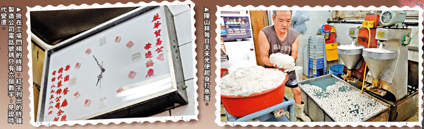 陳山林在工場的回憶一幕接一幕,他20歲入工場做魚蛋,至今已40年,風雨不改,天未光就要抵達工場聽電話接訂單、打魚肉、唧魚蛋、執貨、送貨,大半生在工場過:「要結業喇,事關細路(子女)不接手,他們要周六、日休息,這行沒有停休,其實子女讀到書,不接手也罷!」