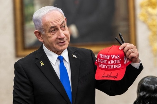 特朗普8日回贈內塔尼亞胡一頂紅色棒球帽並在上面簽名,帽子上印有「特朗普在所有事情上都是對的」字樣。