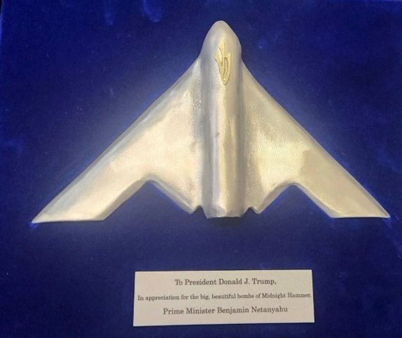 這份禮物附帶的小牌匾寫着,「致唐納德·J·特朗普總統,感謝『午夜之錘行動』(美國針對伊朗的軍事行動代號)投下巨大而美麗的炸彈」。報道說,負責製作這件禮物的以色列鐵匠兼藝術家亞倫·鮑勃暗示,這一B-2轟炸機造型的「門柱聖卷」裝飾盒由被擊落的伊朗導彈殘骸打造而成。