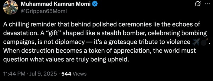 有網友評論說,「令人不寒而慄的是,在光鮮的儀式背後,回蕩着毀滅的餘音。用形似隱形轟炸機的『禮物』慶祝轟炸行動,這不是外交——而是對暴力的荒誕致敬。當毀滅成為表達謝意的象徵時,世人必須質疑:這究竟在維護何種價值觀。」