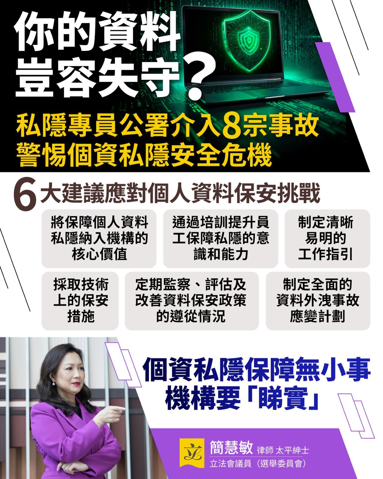 作為個人資料(私隱)諮詢委員會委員,筆者呼籲所有機構積極採納公署提出的六項建議,加強員工對保障個人資料私隱的意識,培養良好的工作習慣,構建一個保障個人資料私隱及數據安全的工作環境!
