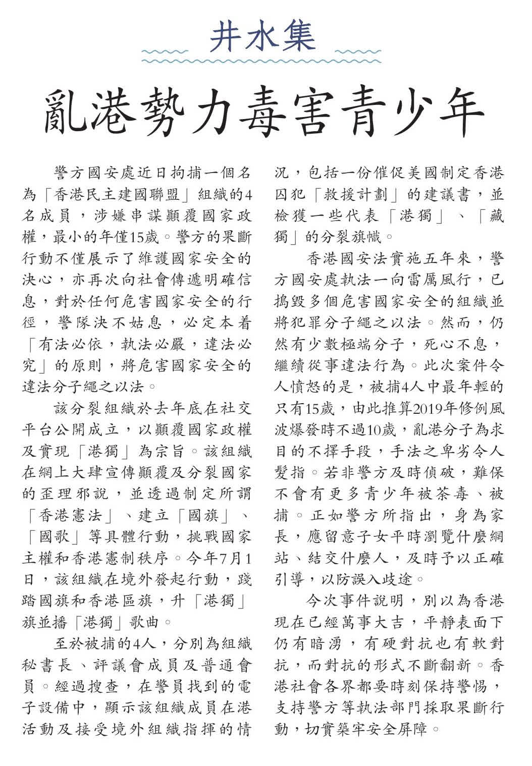 香港國安法實施五年來,警方國安處執法一向雷厲風行,已搗毀多個危害國家安全的組織並將犯罪分子繩之以法。然而,仍然有少數極端分子,死心不息,繼續從事違法行為。此次案件令人憤怒的是,被捕4人中最年輕的只有15歲,由此推算2019年修例風波爆發時不過10歲,亂港分子為求目的不擇手段,手法之卑劣令人髮指。若非警方及時偵破,難保不會有更多青少年被荼毒、被捕。正如警方所指出,身為家長,應留意子女平時瀏覽什麼網站、結交什麼人,及時予以正確引導,以防誤入歧途。