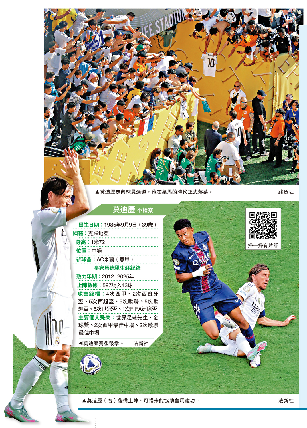 (大公報 記者 譚德龍)歐聯「王中之王」皇家馬德里,於昨晨世冠盃4強面對新科歐聯盟主巴黎聖日耳門,全場竟無還擊之力下慘敗0:4出局,同時代表效力球隊長達13年、成為隊史奪標次數最多球員的39歲中場「魔術師」莫迪歷,正式與皇馬說再見,新球季將轉戰意甲披上「紅黑兵團」AC米蘭的戰衣。曾經與莫迪歷並肩作戰的現任皇馬主帥沙比阿朗素,遺憾前者要嘗到苦澀的離別,但堅信該名克羅地亞國腳留下的寶貴資產,球隊在往後仍會受用。