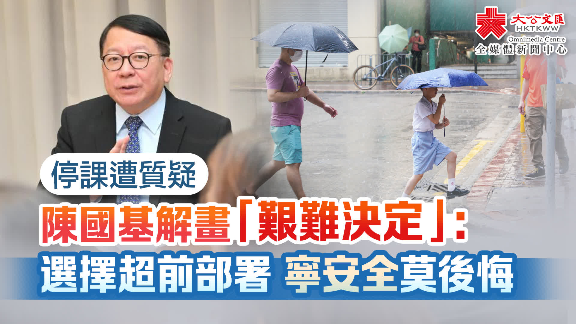 大公文匯全媒體報道,受熱帶氣旋丹娜絲的殘餘影響,天文台7月10日半日內三度發出紅雨警告。政務司司長陳國基今日(11日)在社交平台發題為「艱難的決定」一文,解釋昨日「超前決定」停課和更改中一入學註冊日期的決定,以及天文台多次頻繁轉換黃雨及紅雨信號的原因。