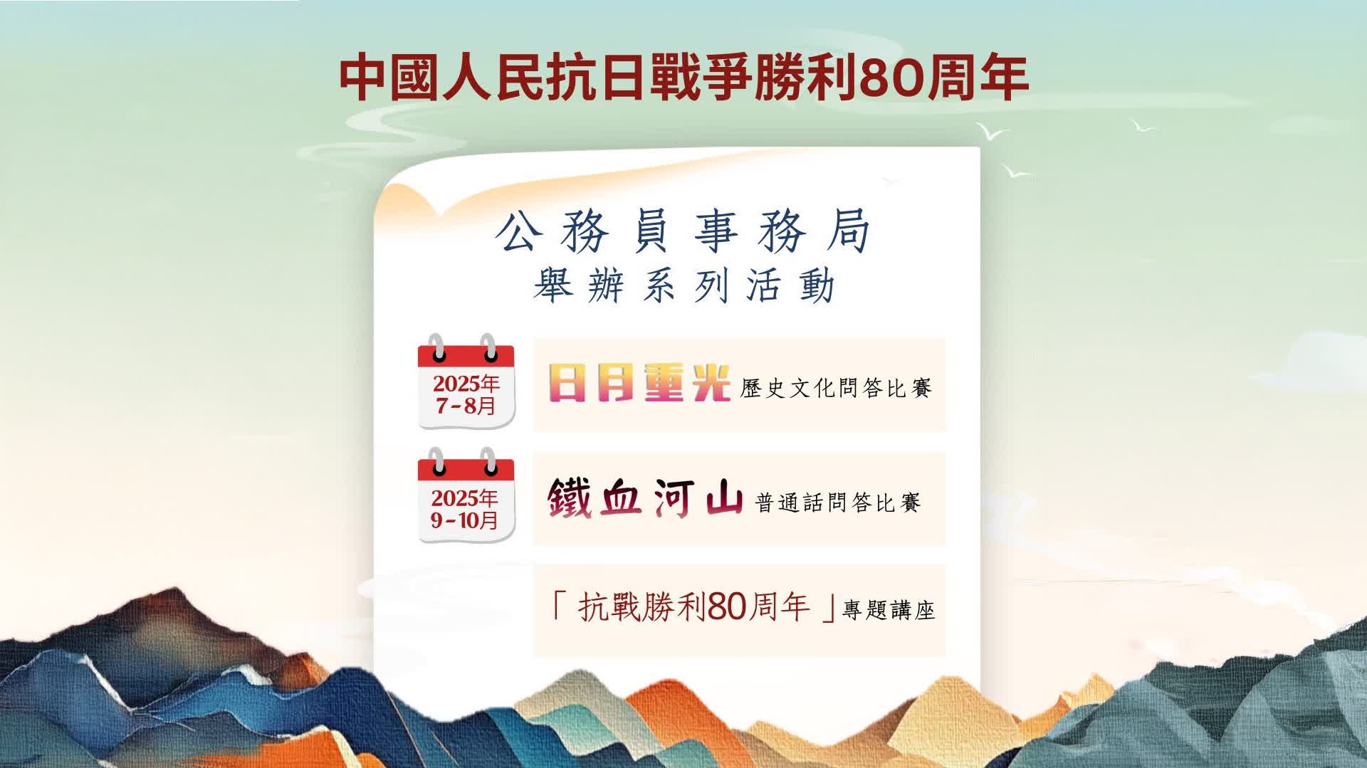 今年是中國人民抗日戰爭暨世界反法西斯戰爭勝利80周年 (抗戰勝利80周年),而今年7月7日是「七七事變」88周年紀念日。88年前,「七七事變」的爆發,是日本全面侵華的開始,也是中國全民族抗戰的開端。公務員事務局於7月至10月舉辦系列活動,包括專題講座和歷史文化及普通話問答比賽,讓政府人員銘記歷史,緬懷先烈,領會中華兒女團結不屈的民族精神。