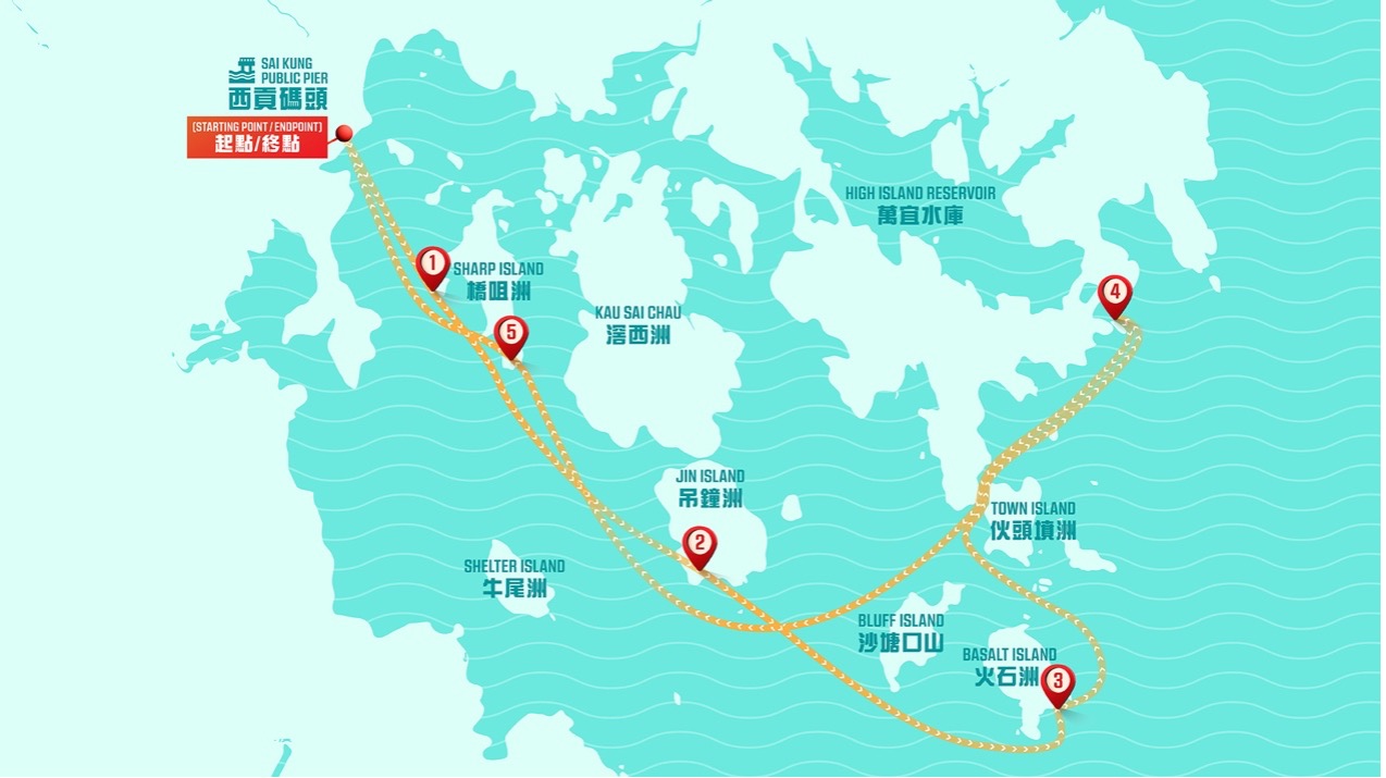 🚤 路線:西貢海濱公園(起點)→ 橋咀洲(登岸)→ 吊鐘洲 → 火石洲 → 破邊洲 → 象鼻洞 → 西貢公眾碼頭(終點)