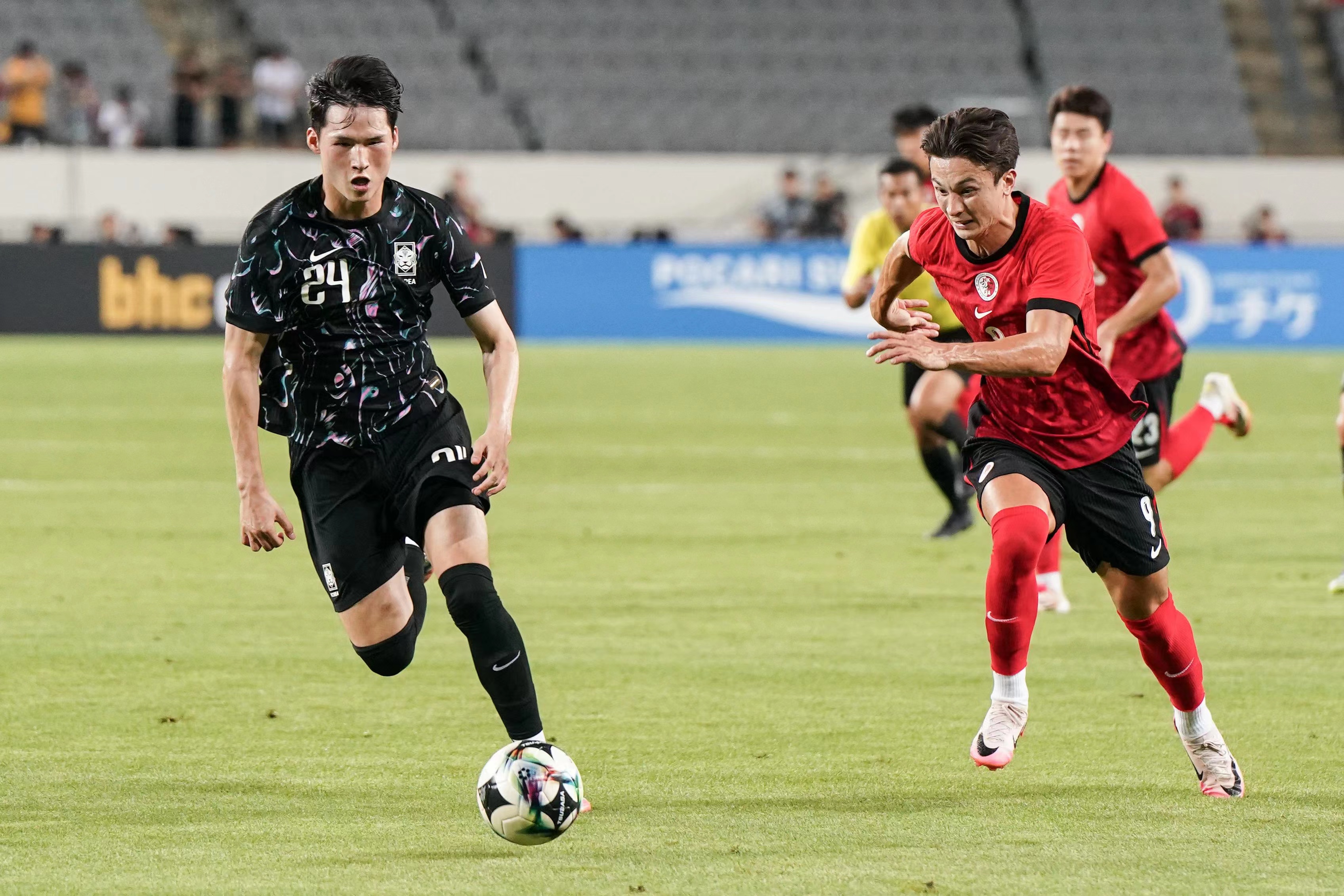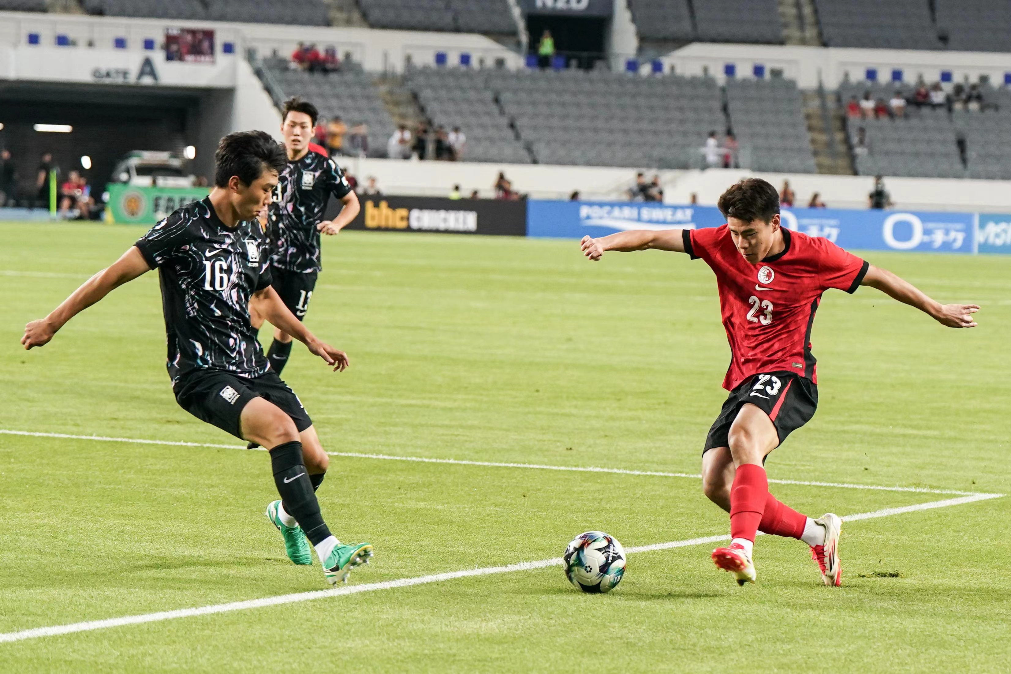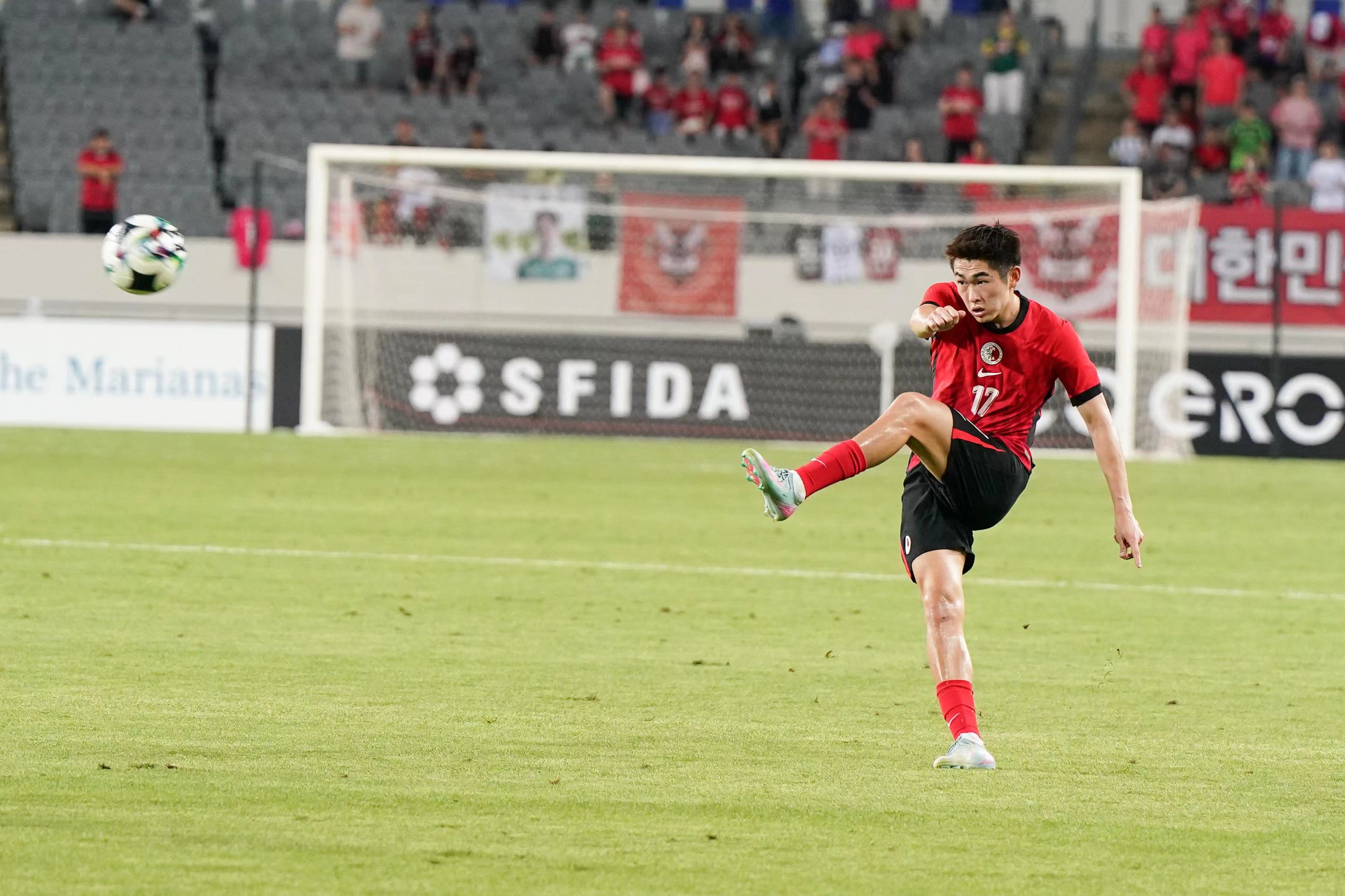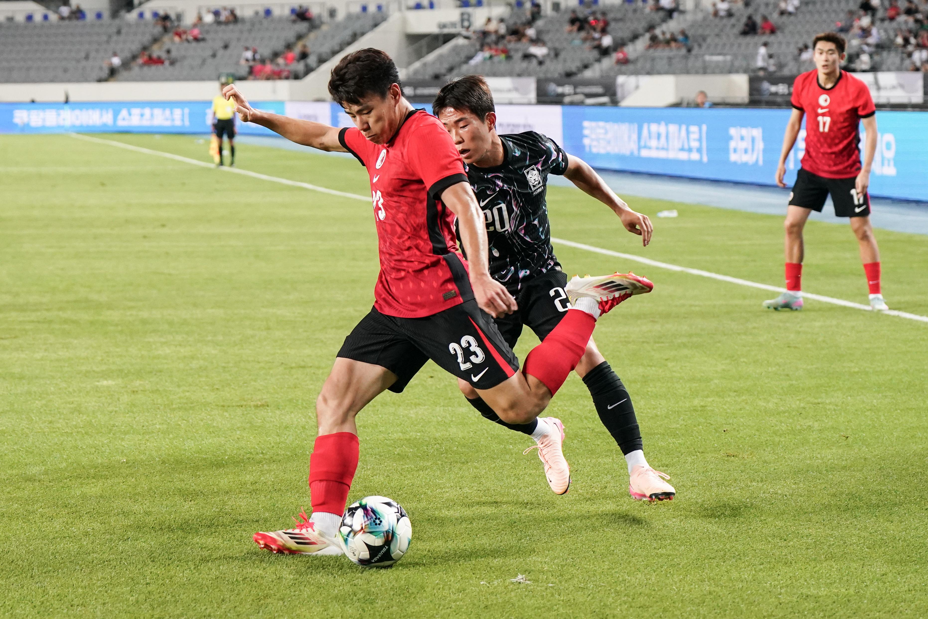 此場港足對韓國的東亞盃賽事吸引了超過5500名觀眾入場,當中有數百名港足球迷遠赴韓國支持,佔據體育場的一邊看台。經歷上場大敗於日本腳下,港足今場對東道主韓國變陣出擊,收起中場顏卓彬,派出米高與安永佳合組雙箭頭改踢442陣式,開賽後港足刻意縮後加強防守,上半場早段未予韓國隊太多空位進攻,可惜到26分鐘仍然失守,韓國徐旻佑直線送入禁區,姜尚潤轉身擺脫對手後右腳射遠柱入網成1-0,直到完半場前韓國再有機會,李承元左路傳中,羅相鎬頭鎚攻門被葉鴻輝飛身擋出。
