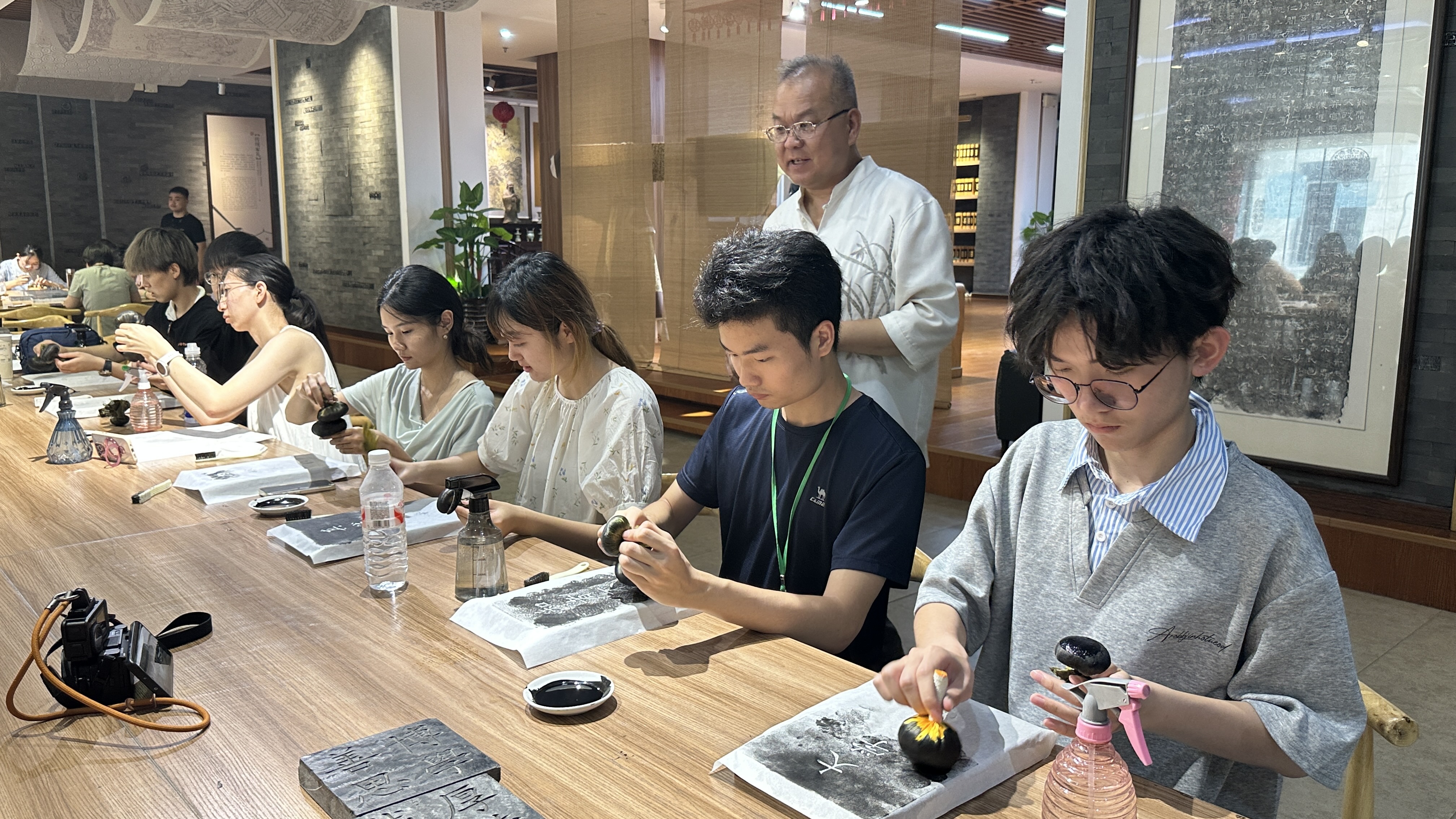 拓印環節,傳媒學子跟着老師了解拓印具體的技藝流程。噴濕宣紙、輕刷入紋、拓包勻墨,古老文字在指尖逐漸清晰。錢宇希拓印的「擇善而從」四字,成為她對傳統文化的註解:「在我看來,這四個字正是傳統價值觀的生動體現——凡事以善為根本,行正確之事,追隨行善守正之人。」
