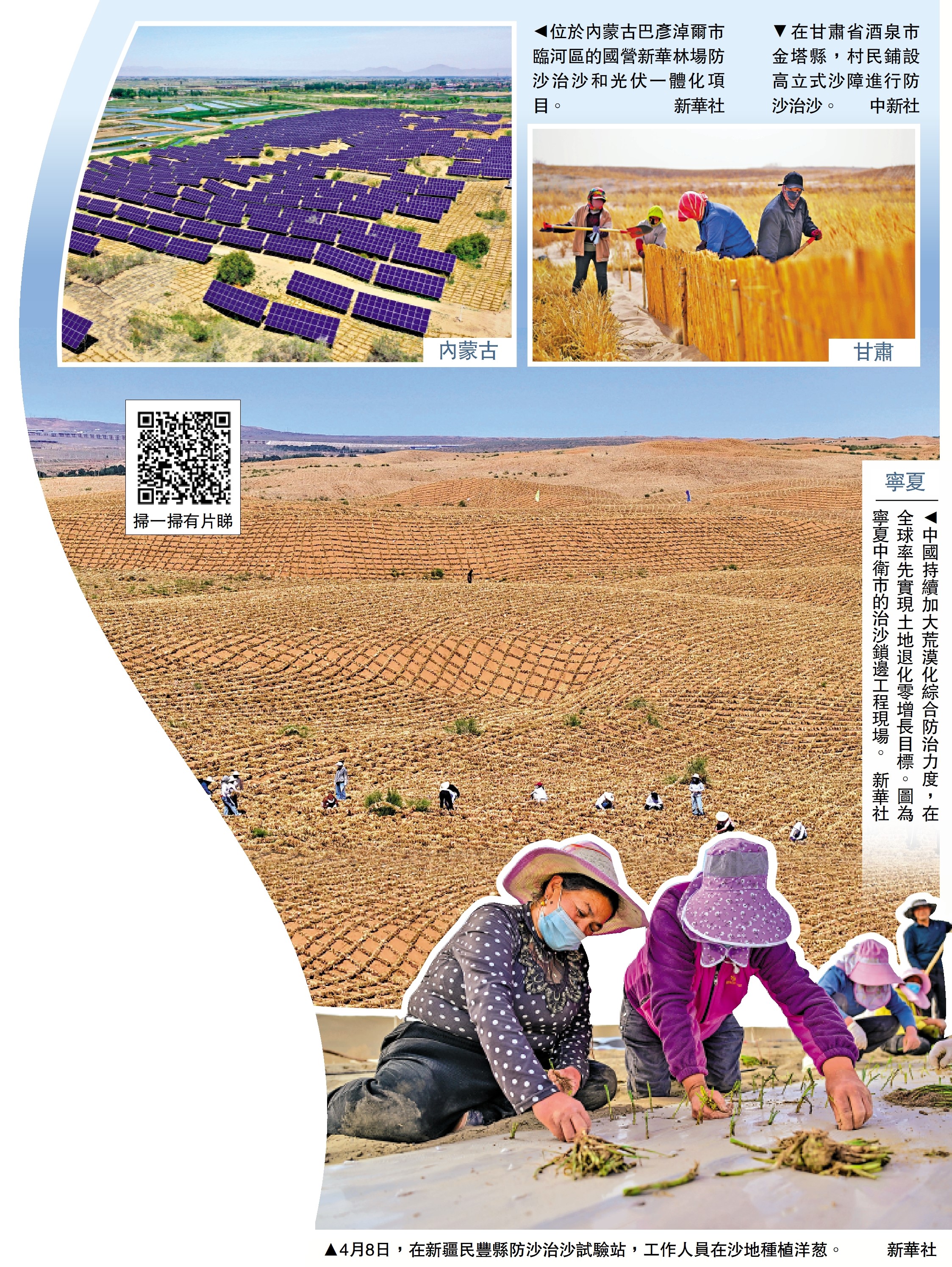 盧琦表示,中國的防沙治沙工作始終秉持系統治理、綜合治理、全域治理理念。從人工栽樹到機器人種樹,從「草方格」固沙到機械自動鋪設沙障,從「五帶一體」鐵路治沙技術體系,到探索荒漠地區無人機飛播造林種草,科技創新助力中國防沙治沙事業構築起「綠色萬里長城」。