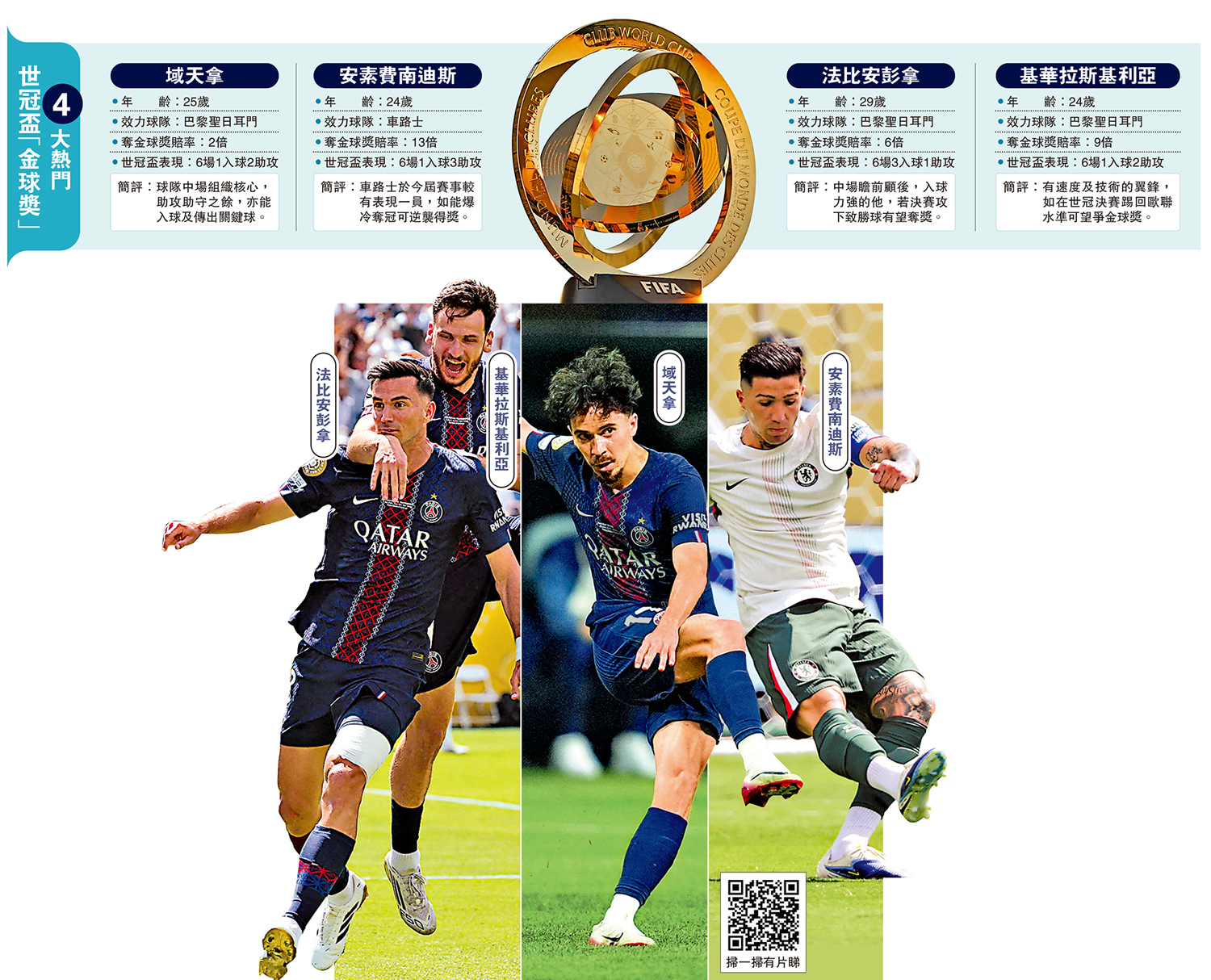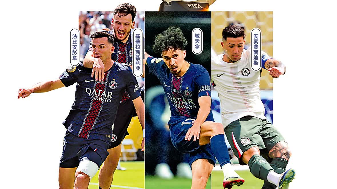 (大公報 記者 梁潤森)世冠盃決賽將於周一凌晨在美國大都會人壽體育場上演,由應屆歐聯冠軍巴黎聖日耳門對陣英超豪門車路士。賽事設有個人獎項「金球獎」(又稱MVP或最佳球員),得主大熱分別為聖門的域天拿、法比安彭拿、基華拉斯基利亞,以及車路士中場鐵漢安素費南迪斯。令人意外是,頂頭大熱域天拿由昔日狼隊棄將,到目前成為歐洲王者中場主力,已贏得今屆法甲、法國盃及歐聯冠軍,只要再贏世冠盃,MVP必成囊中物。