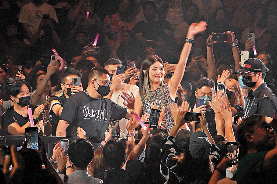 (香港文匯報記者 子棠)陳慧琳(Kelly)合共10場的《SEASON 2 萬人結界演唱會》前晚在紅館華麗開唱,集齊靚人靚衫靚景,更請來鄭秀文(Sammi)驚喜助陣,難得兩大天后同場,不單止快歌勁舞展現天后風采,更上演「醫生診斷」環節製造爆趣畫面,引發全場震耳歡呼!
