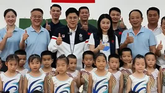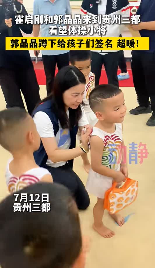 郭晶晶和霍啟剛還去看望了學習體操的孩子,現場,郭晶晶蹲着為孩子們簽名。