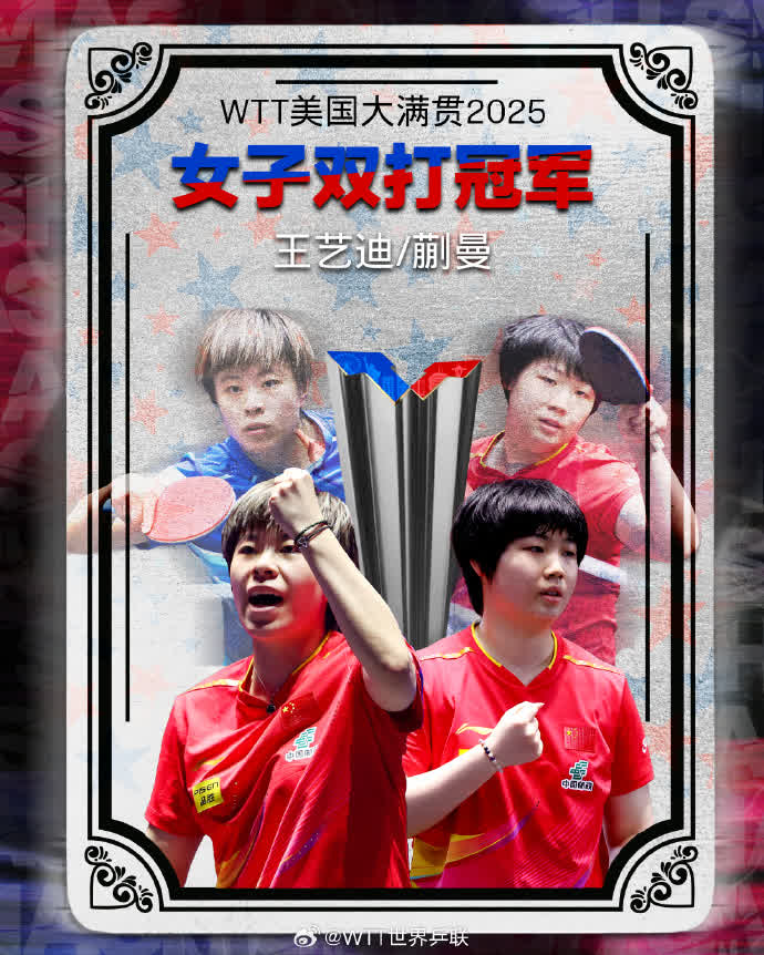 大公文匯網報道,7月13日,WTT美國大滿貫2025女雙決賽中,王藝迪/蒯曼3-2戰勝孫穎莎/王曼昱,王藝迪/蒯曼奪得冠軍,孫穎莎/王曼昱獲得亞軍。