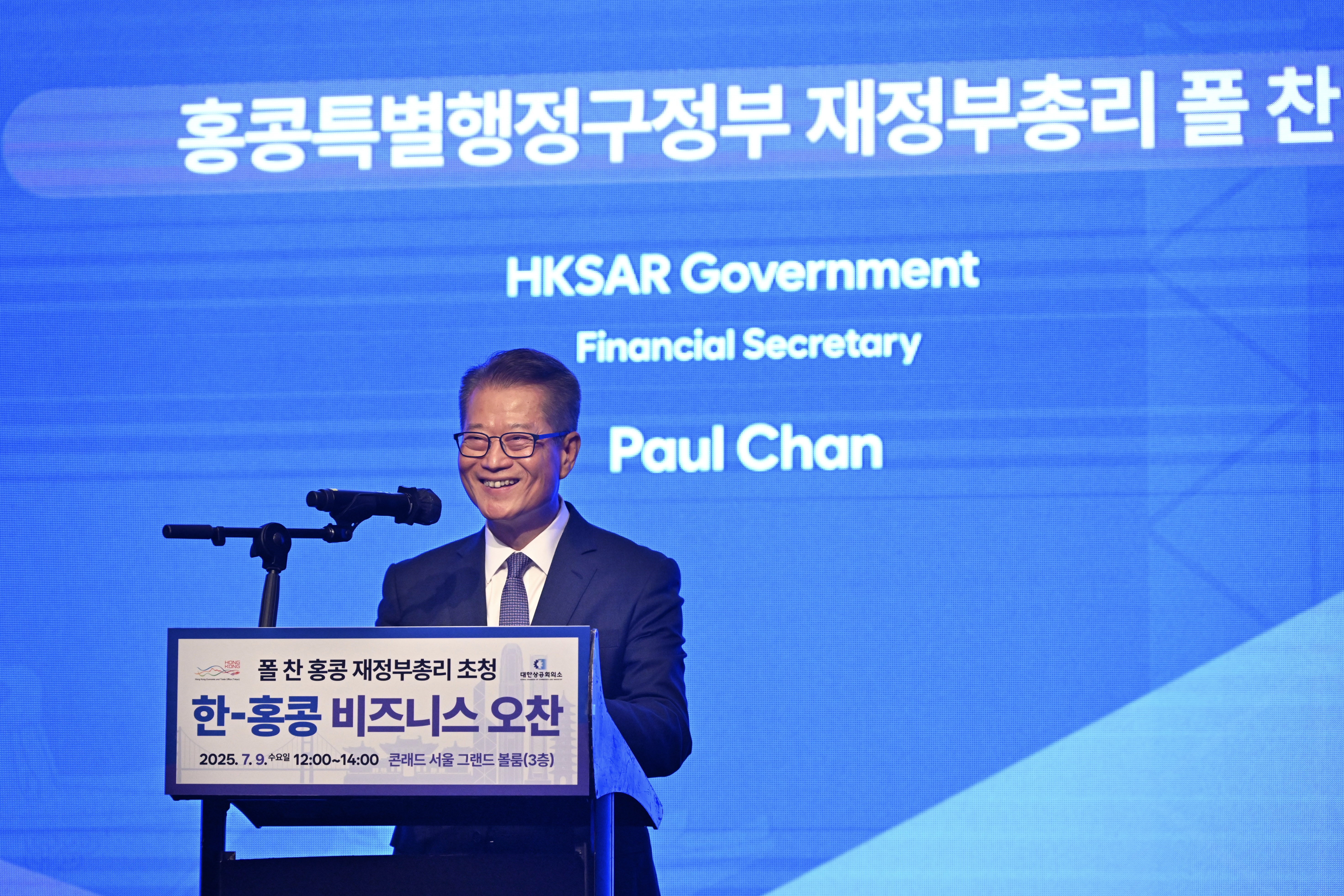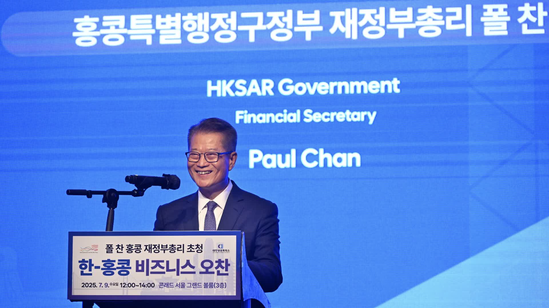 陳茂波指,今年首五個月,在港的韓資持牌機構的證券交易總額已超過1.5萬億港元,是去年全年的2.8倍;韓國的投行也是多隻在港上市新股的基石投資者。他提到,當地金融界的話題之一是「一隻最近在本港上市、錨定一家大型韓國上市科企的『槓桿反向產品』」,由於它是全球首隻錨定這家企業的同類產品,意味韓國投資者如果想買賣相關衍生產品,便只能在香港進行。