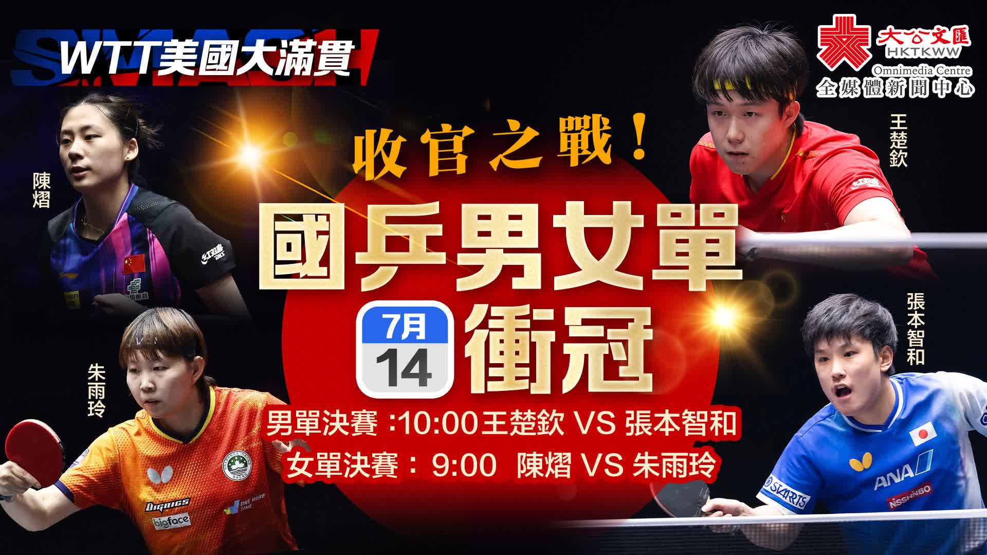 大公文匯全媒體報道,7月14日,WTT美國大滿貫將迎來收官之戰。截至目前,國乒已斬獲混雙冠軍、女雙冠亞軍。在明日的比賽中,國乒將衝擊男、女單兩座冠軍。男單方面,王楚欽將對陣日本選手張本智和;女單方面,將由國乒小將陳熠迎戰中國澳門名將朱雨玲。