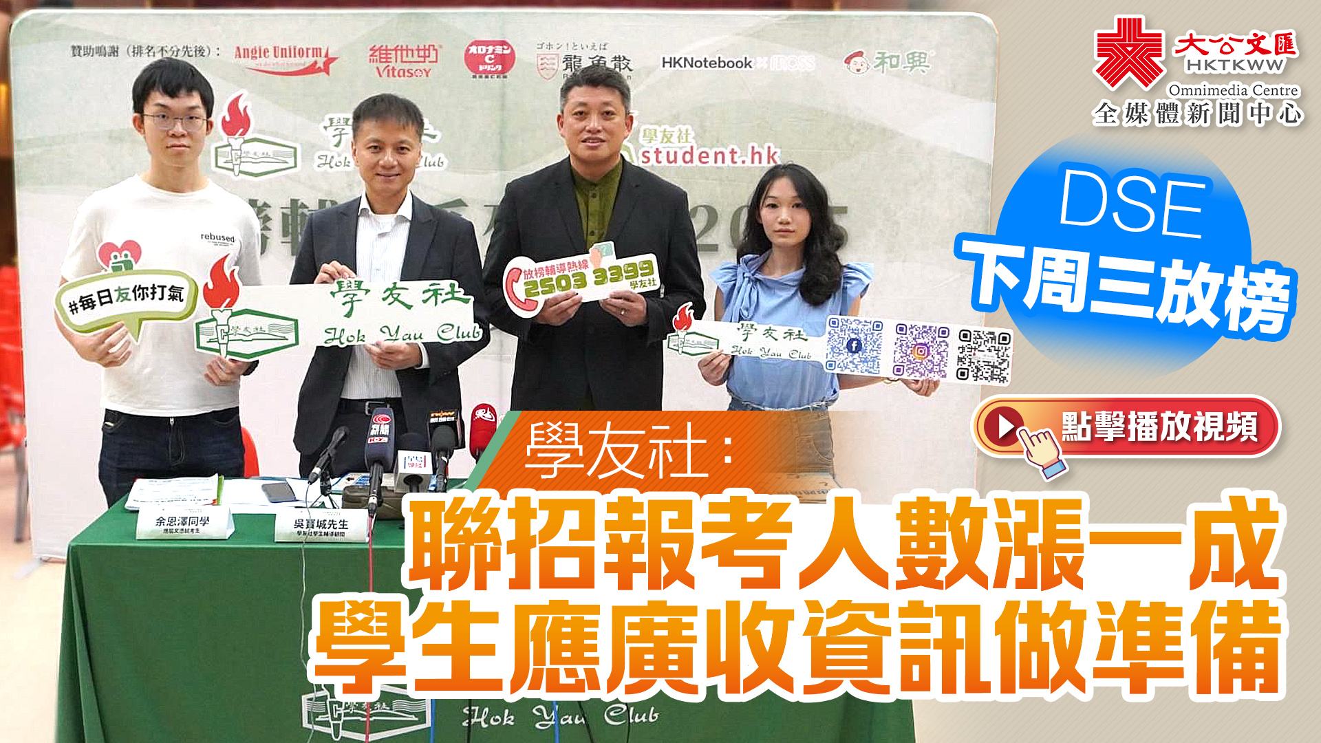 學友社邀請兩位應屆文憑試考生分享自己的心情。考生余恩澤表示面對放榜,自己比較緊張,會擔心分數達不到預期,並令家長失望,他亦表示自己有時會做運動來緩解壓力。余同學還表示,自己也做好「失手」準備,會考慮聯招之外的升學途徑。