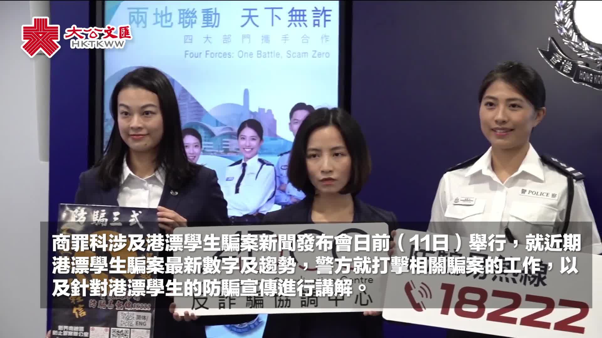 發布會現場,警方向傳媒展示數條由ADCC連同入境處、國家反詐中心及國家移民管理局拍攝的防騙短片。商業罪案調查科反詐騙協調中心高級督察溫璧而介紹指,防騙短片用真實案例來拆解專供「港漂」學生的詐騙手法: