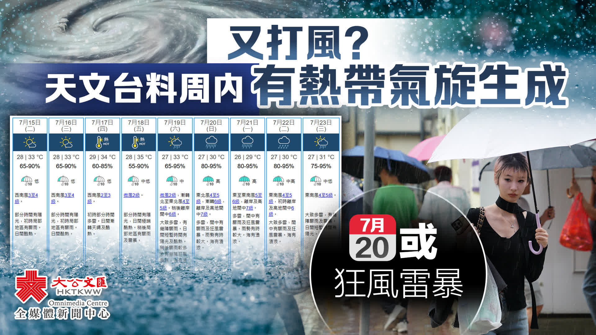 大公文匯全媒體報道,天文台今日(14日)表示,預料一個廣闊低壓區會於菲律賓以東海域逐漸發展為熱帶氣旋,在本周後期靠近呂宋一帶,並有較大機會移入南海北部,但其路徑及強度存在變數。受其外圍下沉氣流影響,本周後期廣東天氣極端酷熱,預測周五市區最高35度;周末至下周初南海北部有驟雨及狂風雷暴,海有湧浪。