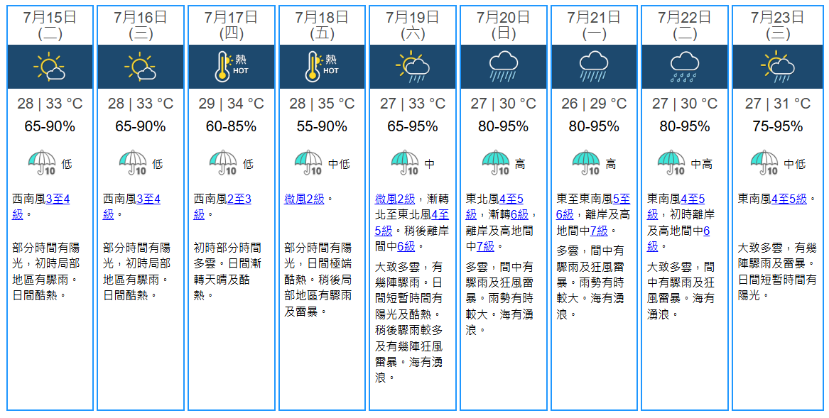 天文台預測,周六(19日)起天氣開始轉差,周日(20日)會受到影響,吹東北風4至5級,漸轉6級,離岸及高地間中7級,間中有驟雨及狂風雷暴,雨勢有時較大。直至下周三(23日),天氣才會有所好轉。