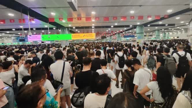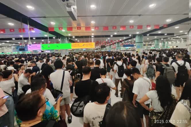 這是晚上10點15分,回港市民擠爆口岸大堂↓