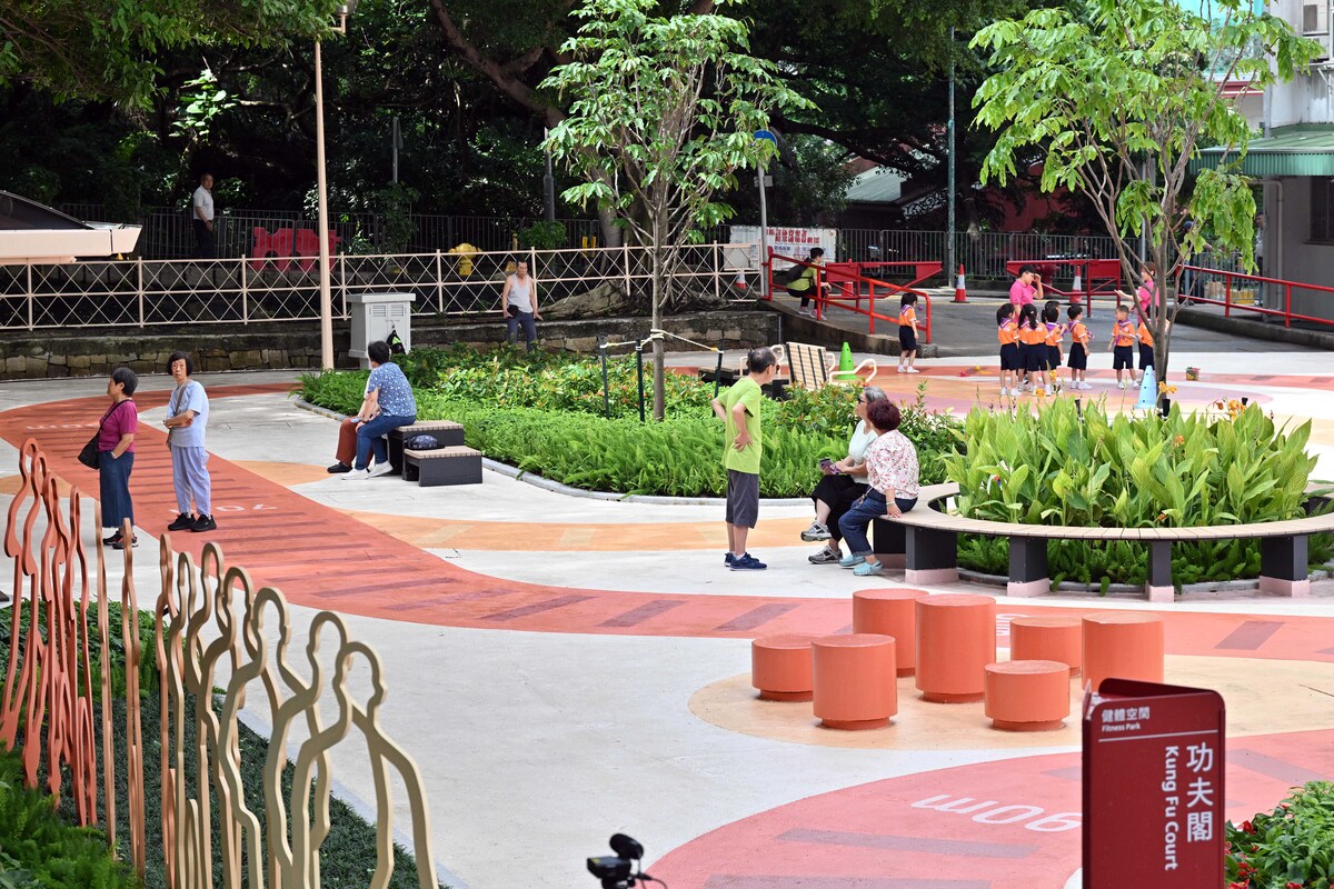 觀塘坪石邨的公用設施剛完成翻新,其中的功夫閣經過升級改造,不但換上鮮豔新裝,更增設一條100米緩跑徑和各款座椅,又加添大量綠化元素。煥然一新的屋邨一隅,締造出更舒適、可讓更多居民享用的公共空間。